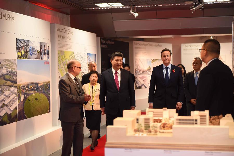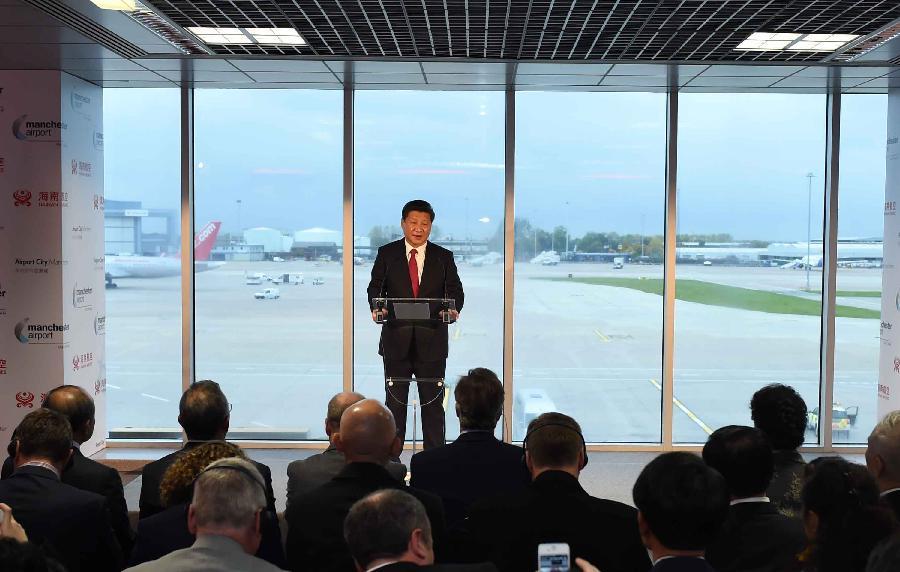 Chinese President Xi Jinping addresses dignitaries during a visit to the airport city in Manchester, Britain, Oct. 23, 2015. (Photo: Xinhua/Zhang Duo)