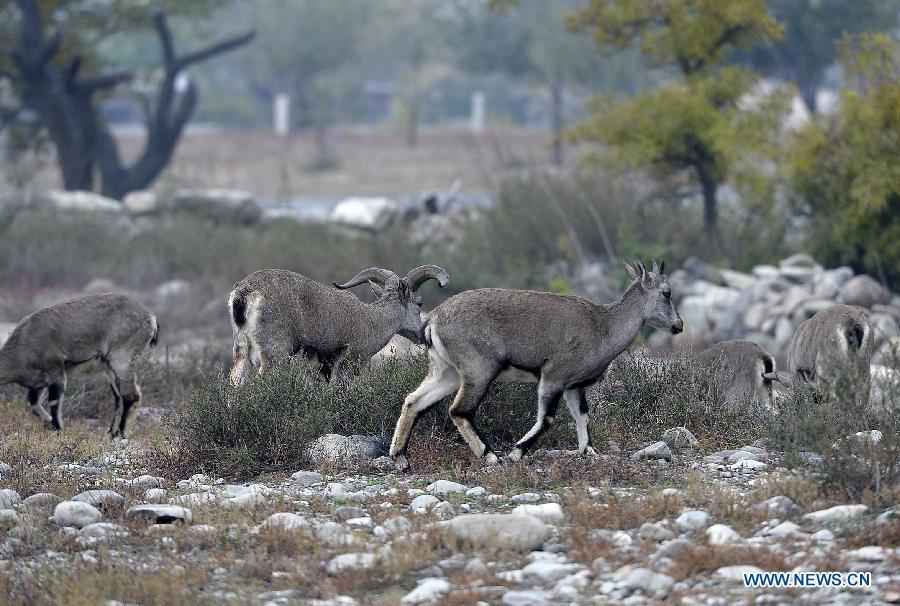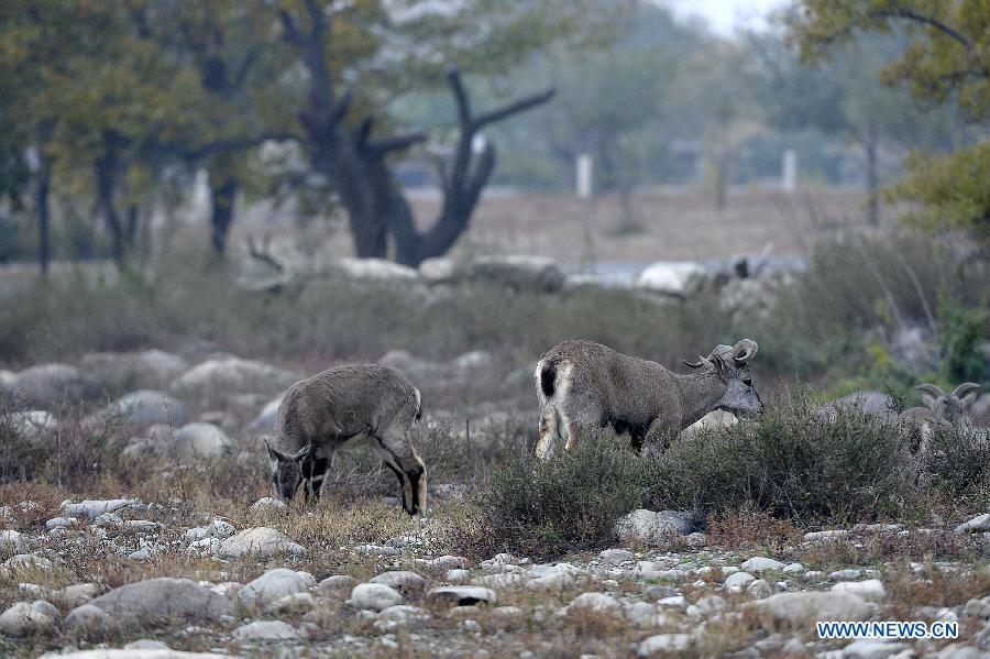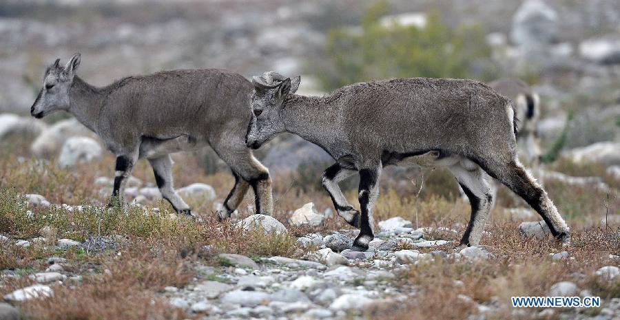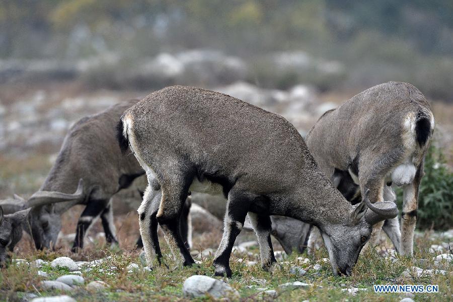 Blue sheep look for food on the Helan Mountain in northwest China's Ningxia Hui Autonomous Region, Oct. 22, 2015. (Photo: Xinhua/Peng Zhaozhi)
