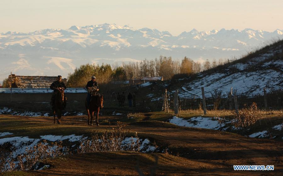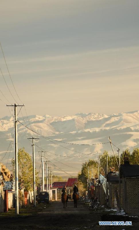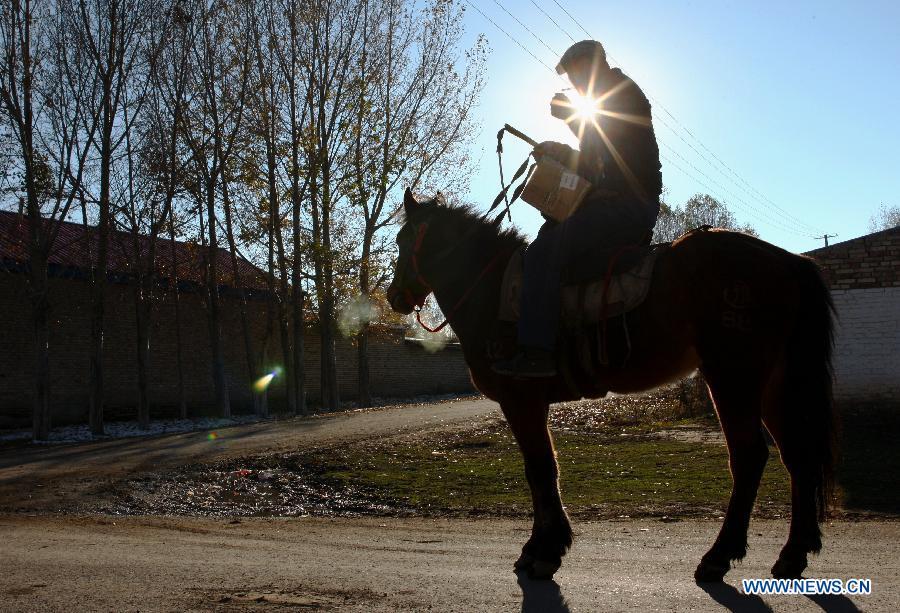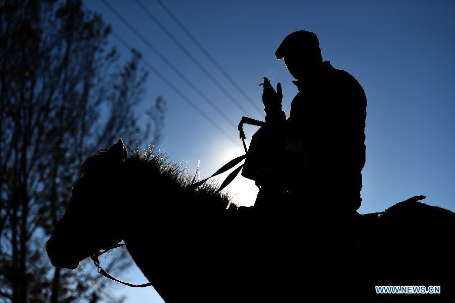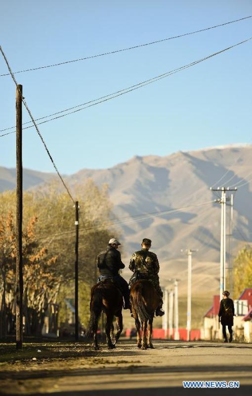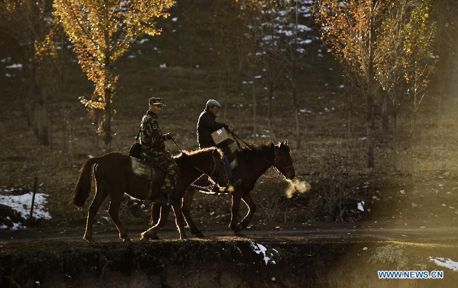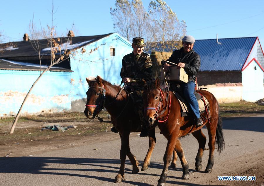 Frontier guard member Nurdain Bek rides a horse to deliver mails to herdsmen who live in remote pastures and mountains in Zhaosu County, Kazak Autonomous Prefecture of Ili, northwest China's Xinjiang Uygur Autonomous Region, Oct. 25, 2015. Policemen and frontier guard members with Tuguqing frontier police substation in Ili volunteer to deliver mails to remote and rural communities that cover an area of 150 square kilometers. (Xinhua/Xia Yifang)