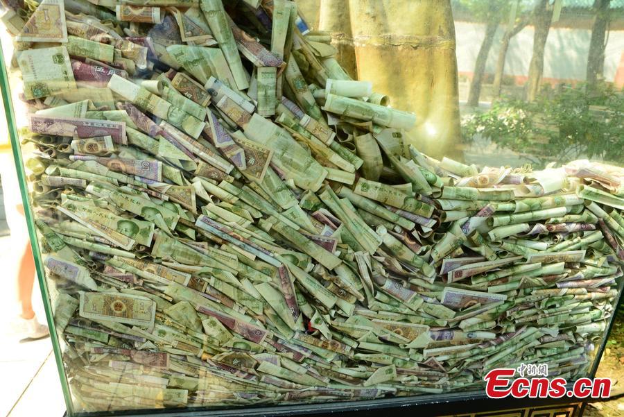 A bronze statue displayed inside a glass case is covered in notes ranging from 10 cents to 10 yuan ($1.5) tossed by tourists at a folk culture museum in Foshan, South China’s Guangdong province on October 24, 2015. Several statues in the museum are buried under piles of money. In many tourist attractions in China, tourists tossing coins to make wishes has become a tradition. (Photo/CFP)