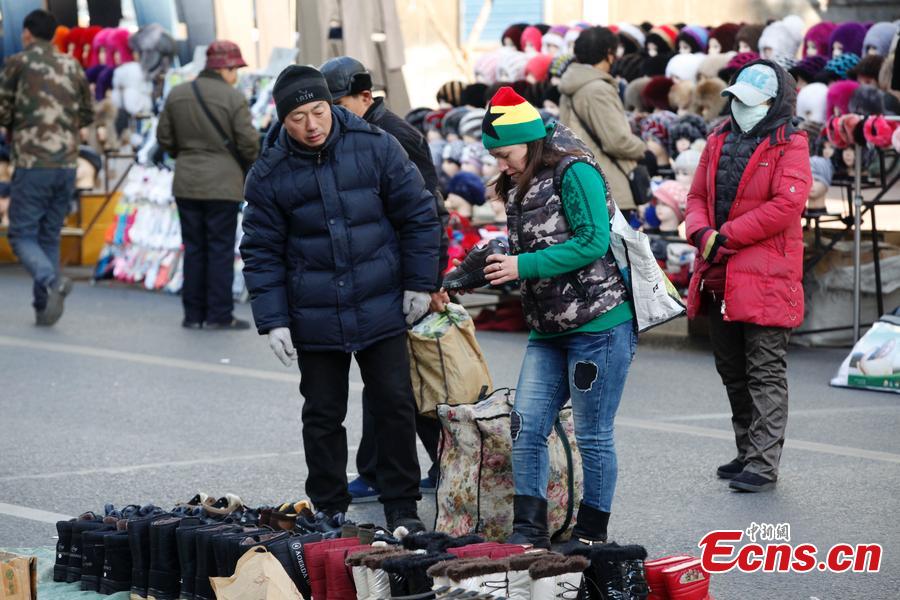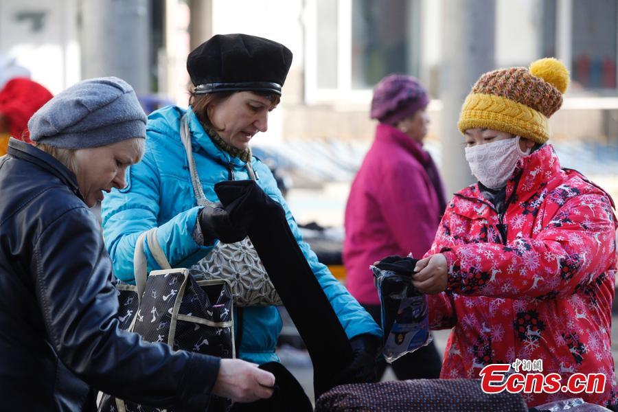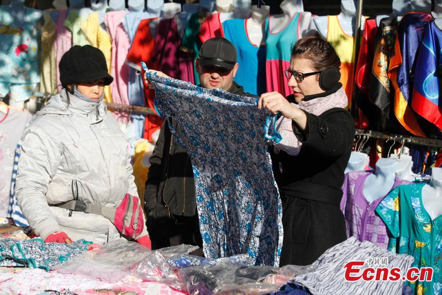 As temperatures hit below zero, Russian 'damas' (middle-aged women) from Blagoveshchensk (capital of the Amur region, Eastern Russia) begin purchasing their winter gear in Heihe, a border city in Northeast China's Heilongjiang province, Oct 25, 2015. (Photo/CFP)