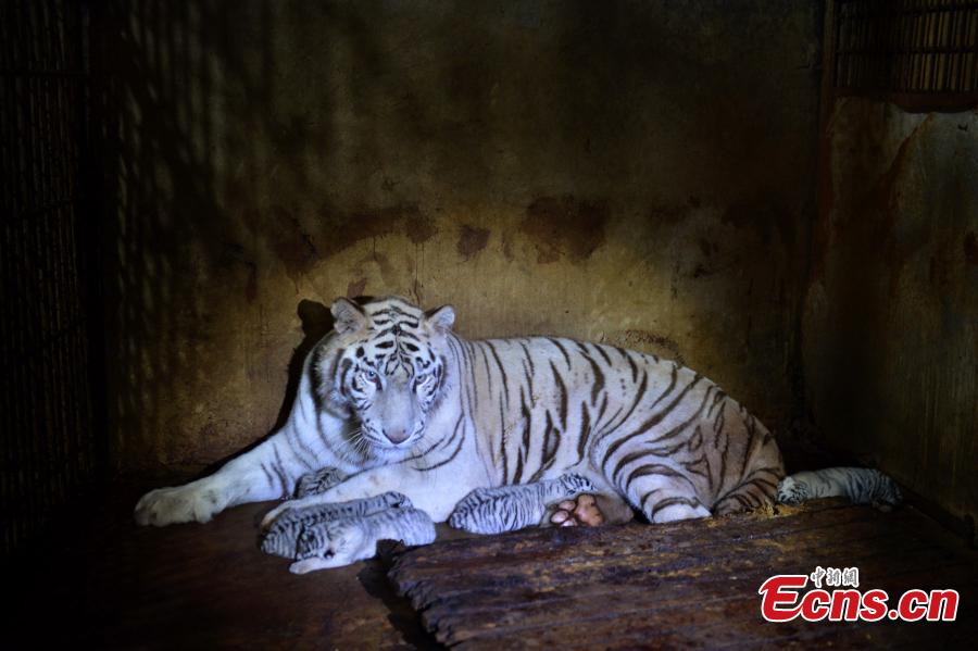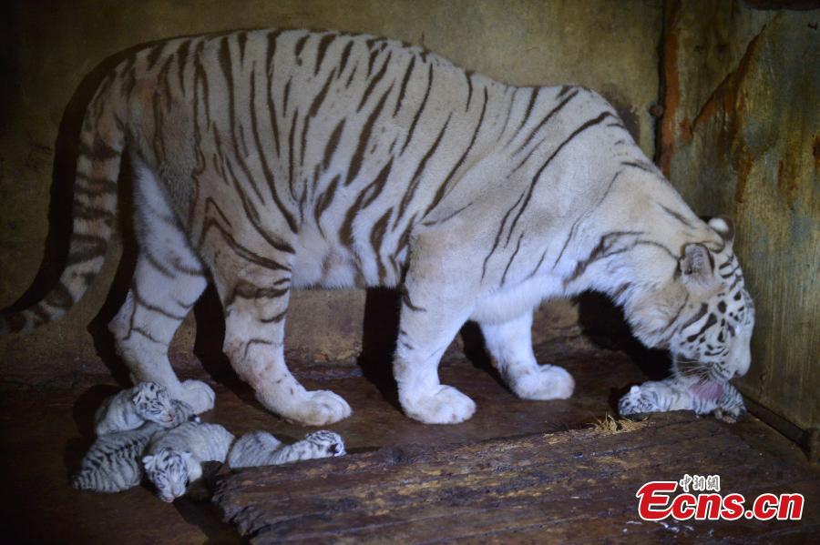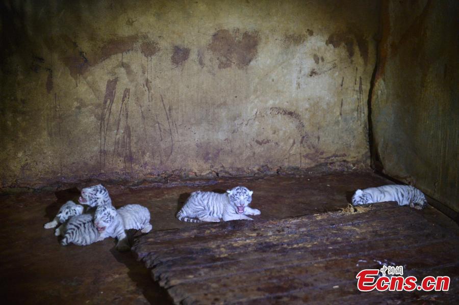 White tiger cubs take rest beside their mother at their habitat in a safari park in Kunming, Southwest China’s Yunnan province on October 26, 2015. It took the six-year-old female tiger two hours to give birth to the quintuplets on Monday. All of the five white tiger cubs are healthy. (Photo/CFP)