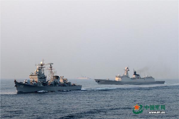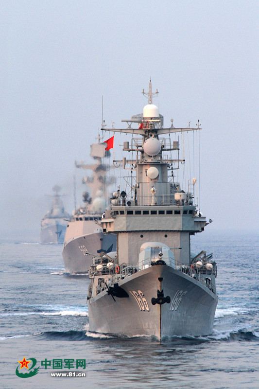 Soldiers ride in boats from a destroyer to conduct a visit, board, search and seizure training exercise aboard a simulated enemy vessel. Recently, a guided-missile destroyer flotilla under the South China Sea Fleet of the PLA Navy organized its warships to conduct a realistic confrontation training exercise, including such subjects as formation offense and defense, visit, board, search and seizure, anti-shore firing at night and anti-aircraft firing in complex electromagnetic environment. (Photo/81.cn)