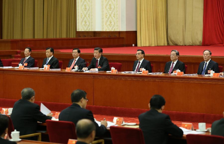 Top Communist Party of China (CPC) and state leaders Xi Jinping (C), Li Keqiang (3rd R), Zhang Dejiang (3rd L), Yu Zhengsheng (2nd R), Liu Yunshan (2nd L), Wang Qishan (R) and Zhang Gaoli (L) attend the Fifth Plenary Session of the 18th CPC Central Committee, in Beijing, capital of China. The meeting was held from Oct. 26 to 29 in Beijing. (Photo: Xinhua/Lan Hongguang)