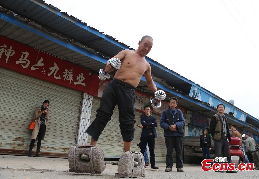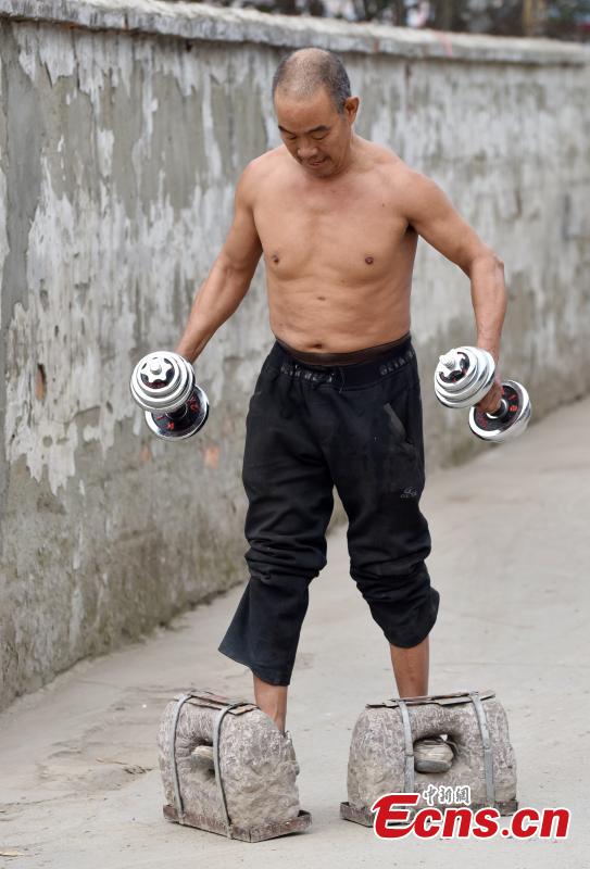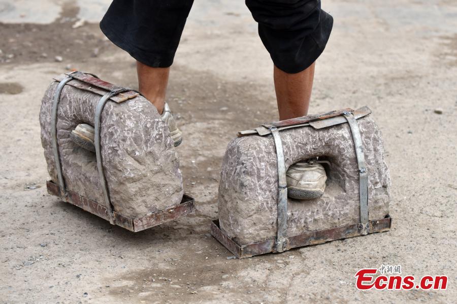 A man walks with a pair of "stone locks" dragged on feet in Chengdu, Southwest China’s Sichuan province on October 30, 2015. Stone lock is a special type of stone dumbbell in shape of old Chinese padlock. The man uses the stone locks to build up strength every morning. (Photo/CFP)