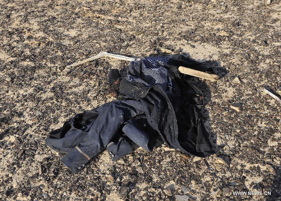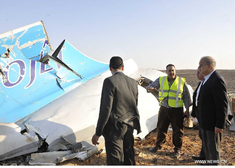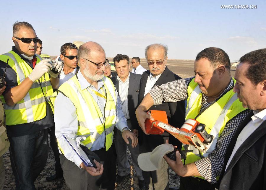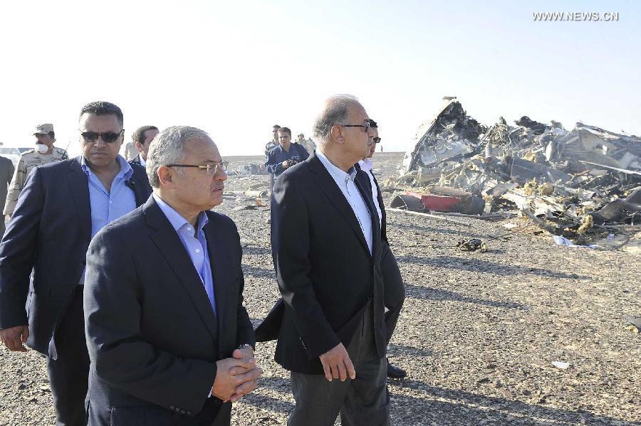 The handout photo from Egyptian Prime Minister Office shows Egyptian Prime Minister Sherif Ismail (R) inspecting the crash site of a Russian passenger plane in Hassana, a mountainous area 35 km south of Arish City, Egypt, Oct. 31, 2015. The black box of the Russian plane that crashed in Egypt's Sinai earlier on Saturday has been found and 129 bodies have been picked up, Egyptian Prime Minister Sherif Ismail said at a press conference. (Photo:Xinhua/Egypt's PM Office)