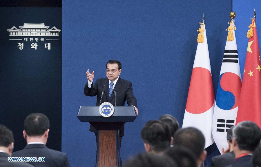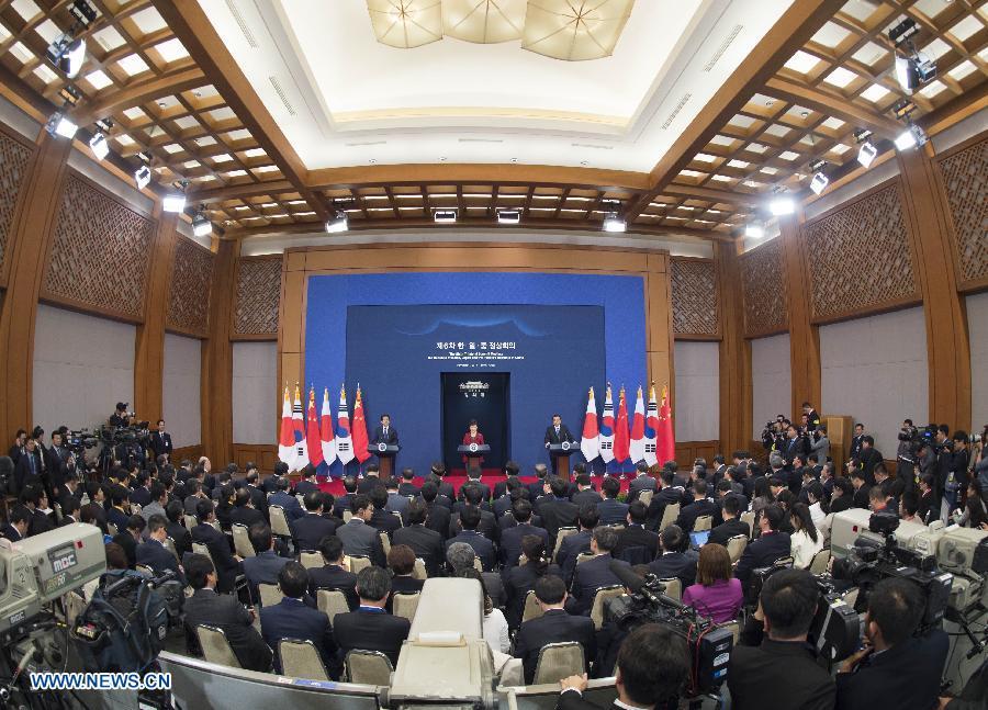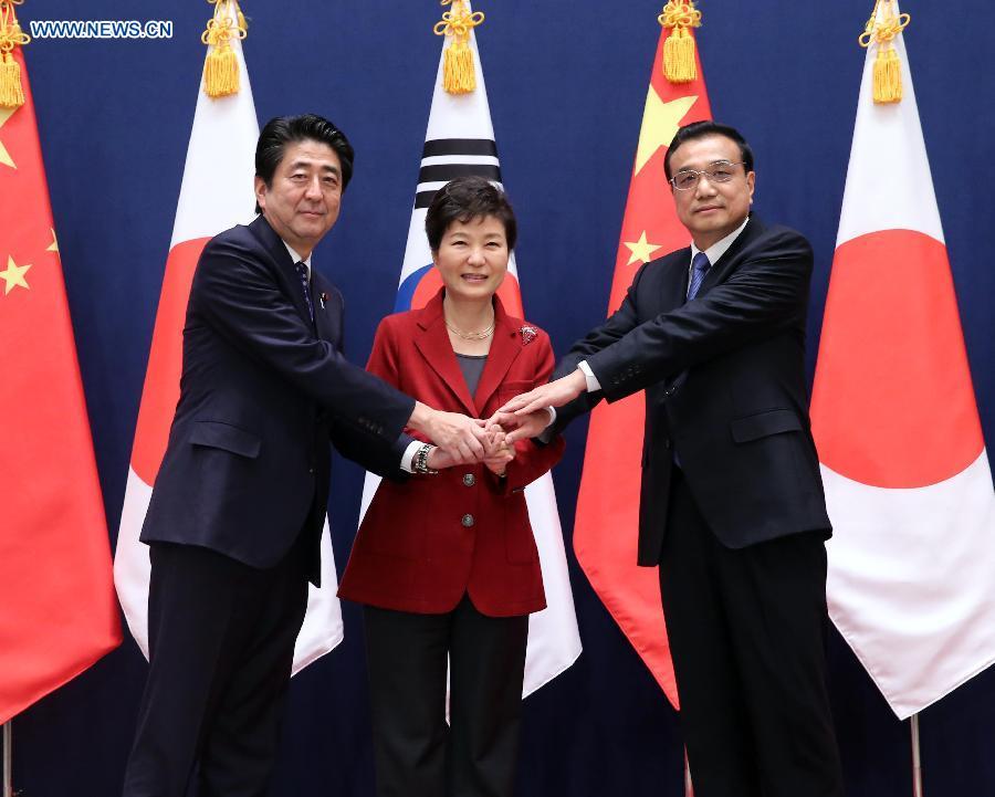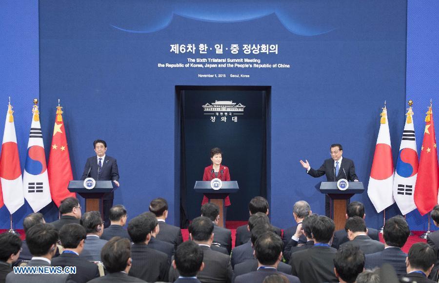 Chinese Premier Li Keqiang (R), Japanese Prime Minister Shinzo Abe (L) and South Korean President Park Geun-hye attend the sixth China-Japan-South Korea leaders' meeting in the South Korean capital of Seoul, Nov. 1, 2015. (Photo: Xinhua/Liu Weibing)