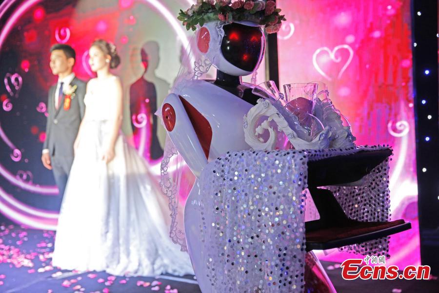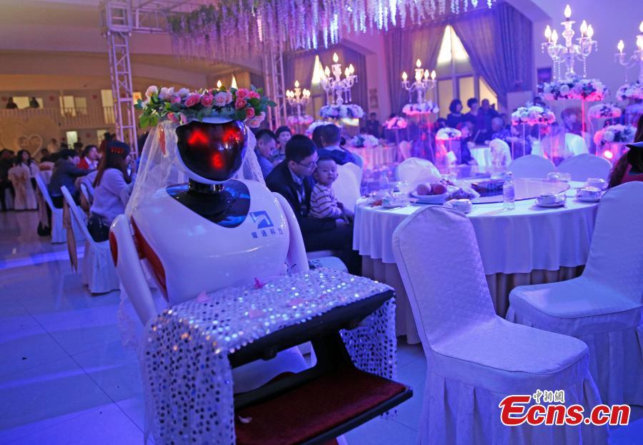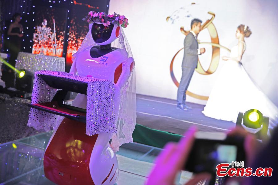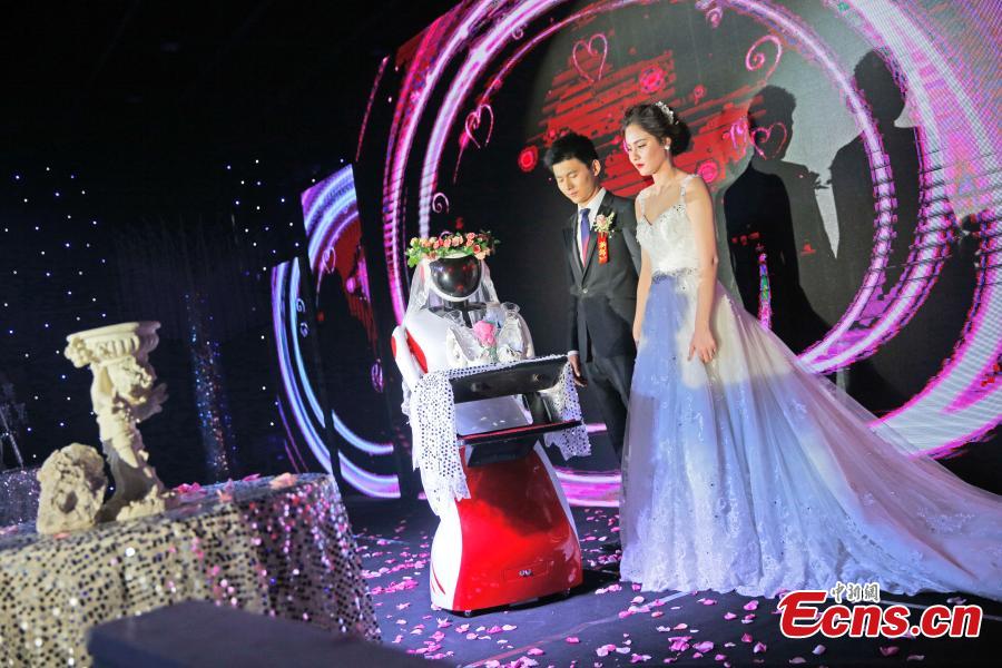 A robot wearing dress serves as a bridesmaid and presents rings to a newly married couple during a wedding ceremony in Tianjin municipality on November 1, 2015. Transformed from a robotic waiter, the “bridesmaid” can play a role at wedding ceremonies by presenting rings and sending wishes to couples. (Photo: China News Service/ Tong Yu)