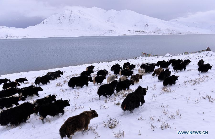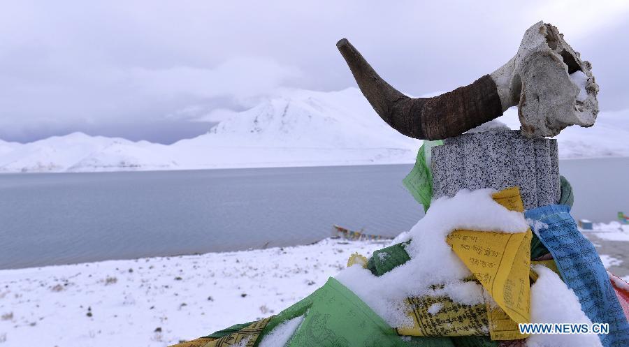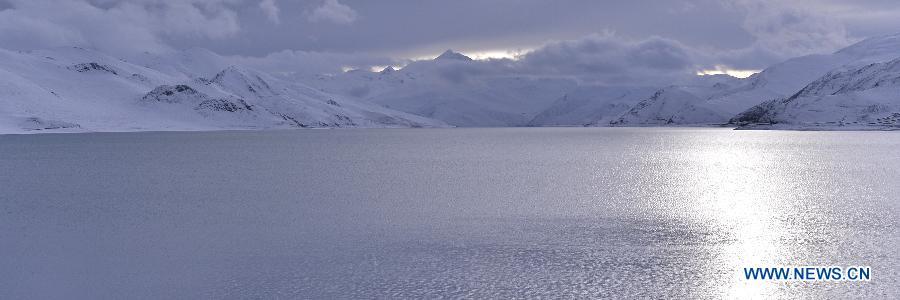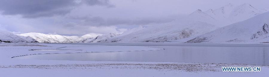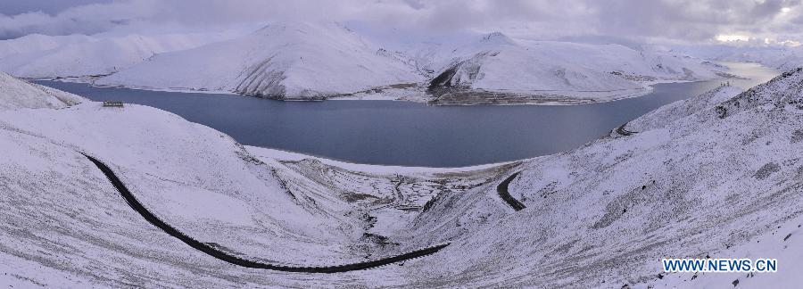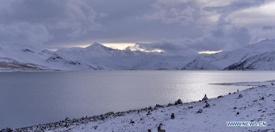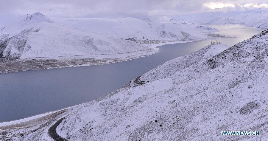 Photo taken on Oct. 31 shows the snow scenery at the Yamdrok Lake in Nagarze County of Shannan Prefecture, southwest China's Tibet Autonomous Region.The Yamdrok Lake, about 100 kilometers south of the region's capital Lhasa, is one of the three holy lakes in Tibet region. (Photo: Xinhua/Liu Dongjun)