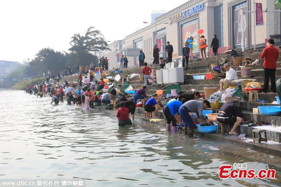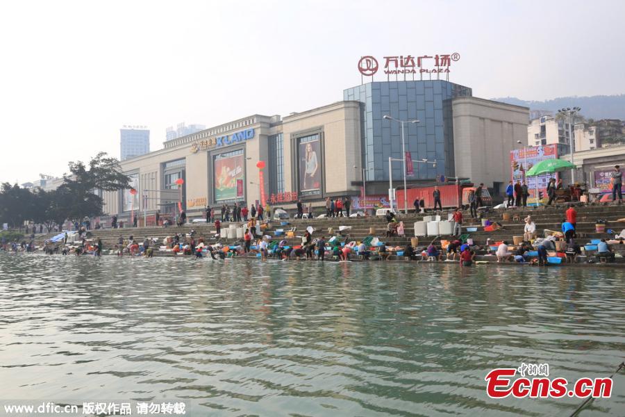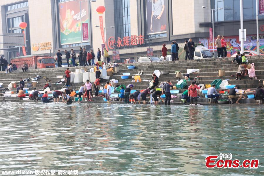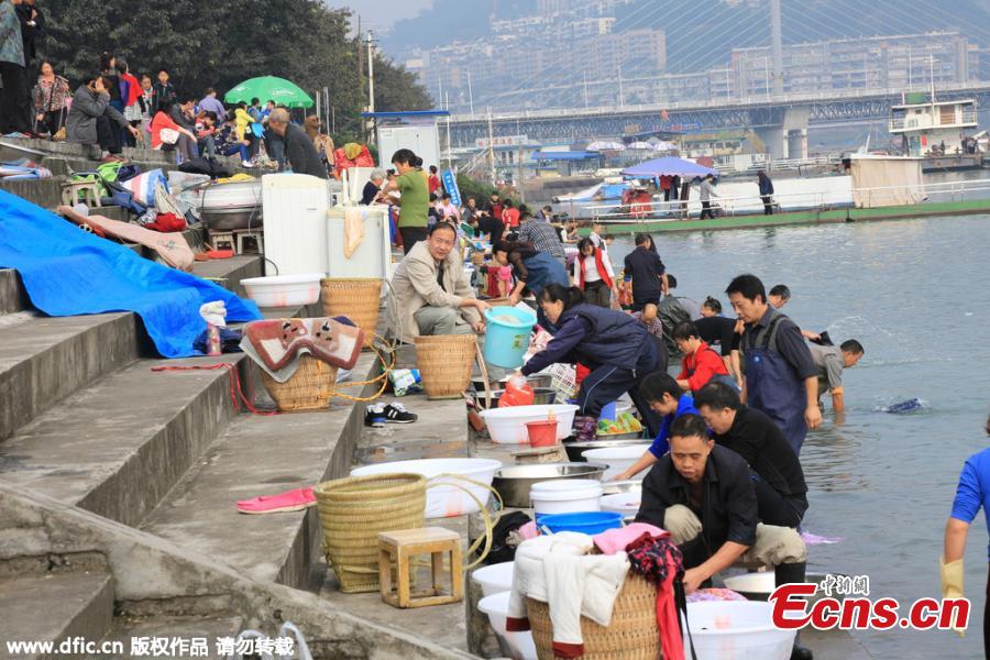 Bringing with basins, washing machines, and laundry, residents enjoy scenery of a reservoir while washing clothes at a wharf in Chongqing municipality on November 1, 2015. Three Gorges Project completed 175 meters impoundment on October 29, 2015. After the impoundment, higher water level makes scenery of the reservoir areas more intoxicating. (Photo/IC)