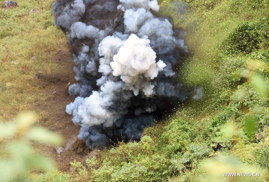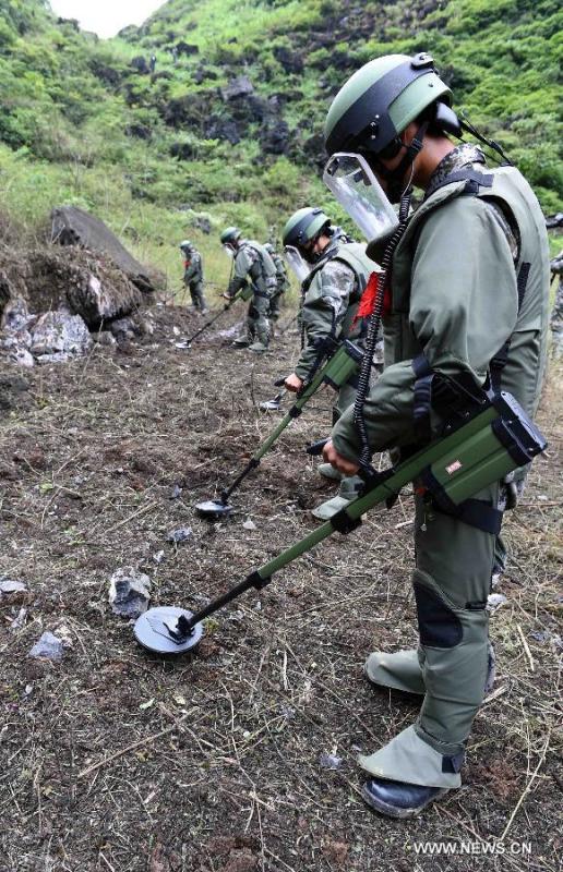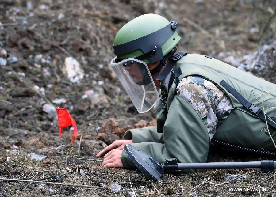 Soldiers clear landmines during a demining drill along the China-Vietnam border on Zheyin Mountain in Masupo County, southwest China's Yunnan Province, Nov. 2, 2015. The People's Liberation Army (PLA) began preparatory work in early August for a demining mission, which will be carried out along the southwestern border areas in Yunnan Province and Guangxi Zhuang Autonomous Region. The operation will finish by the end of 2017. (Photo: Xinhua/Yang Zongyou)