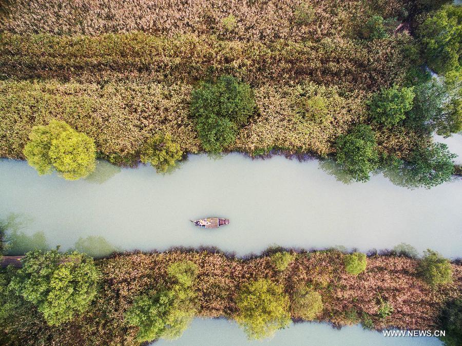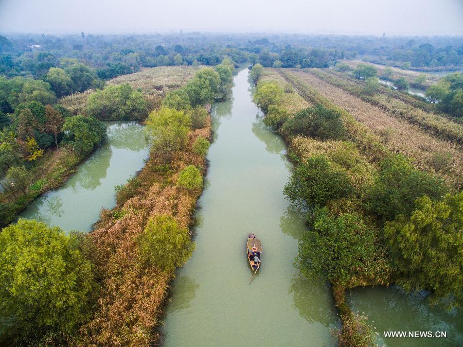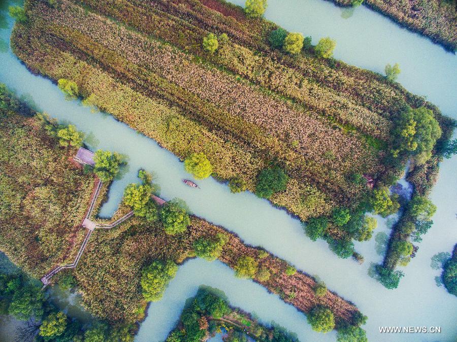 Aerial photo taken on Nov. 3, 2015 shows the autumn scenery of the Xixi Wetland in Hangzhou, capital of east China's Zhejiang Province. (Photo: Xinhua/Xu Yu)