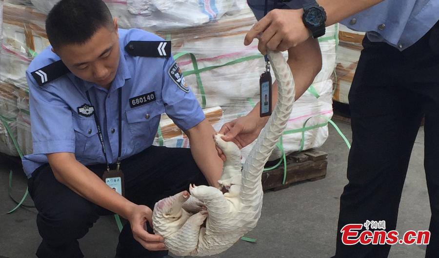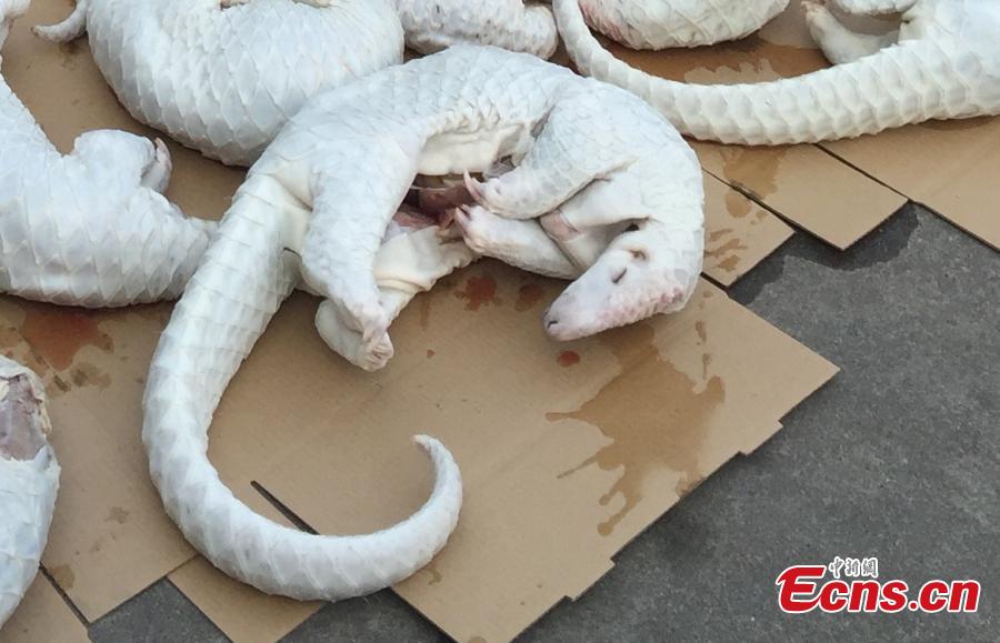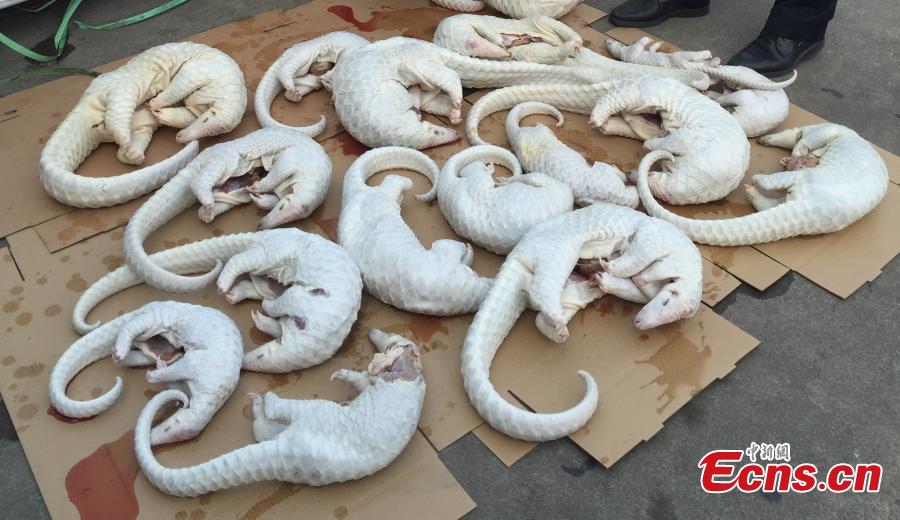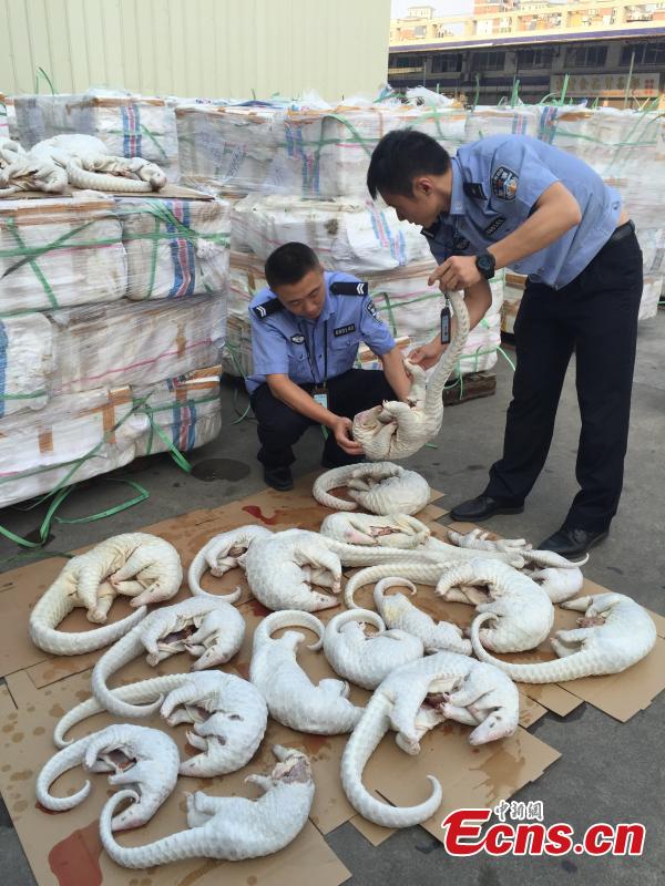 Police officers in South China's Guangdong province seize over 2,000 dead pangolins while busting a wildlife trafficking case on September 14, 2015. The police found 2,674 pangolin carcasses hidden in 414 cool boxes. Pangolins, which are under second-class state protection in China, are often smuggled because their meat is considered a delicacy and their scales are believed to have medical qualities. Under China's criminal law, those who illegally catch, kill, buy or sell endangered wild animals on the state's key protection list could face more than 10 years in jail and fines.(Photo/CFP)