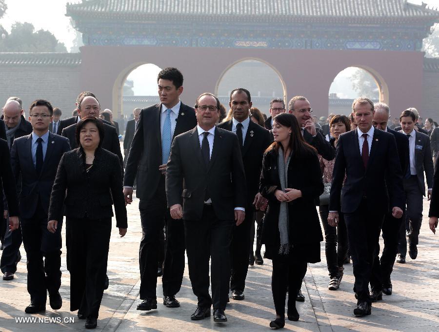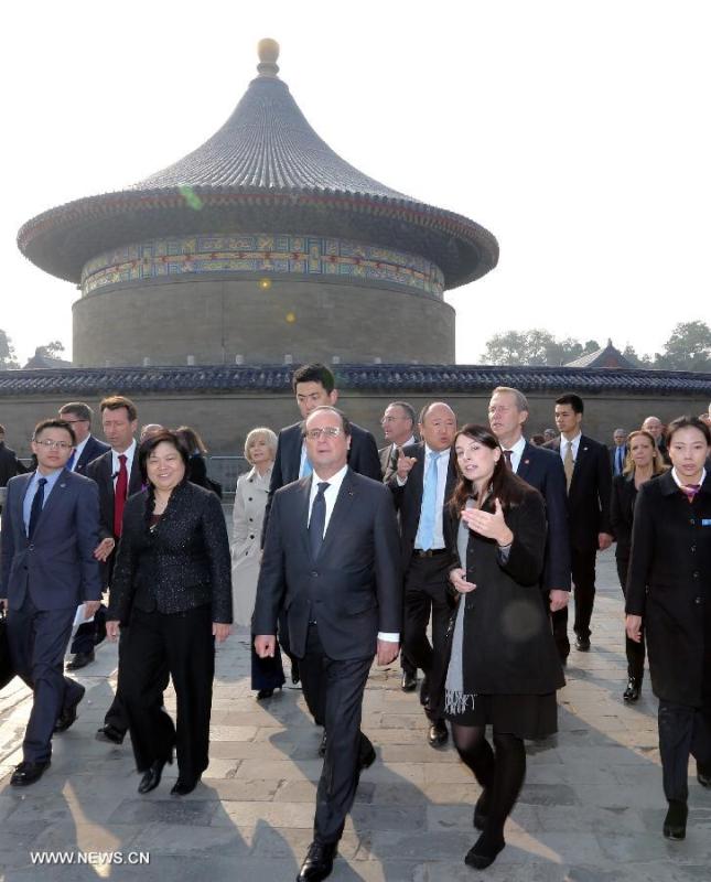 French President Francois Hollande (C) visits the Temple of Heaven in Beijing, capital of China, Nov. 3, 2015. (Photo: Xinhua/Ding Lin)