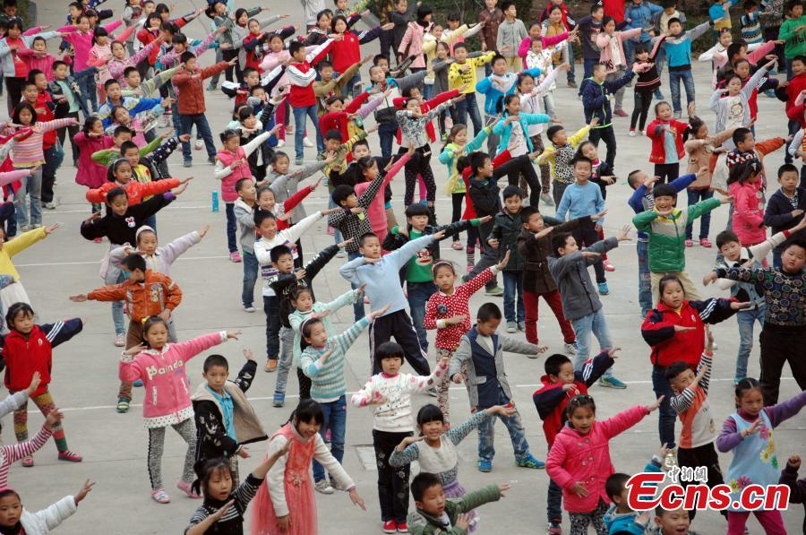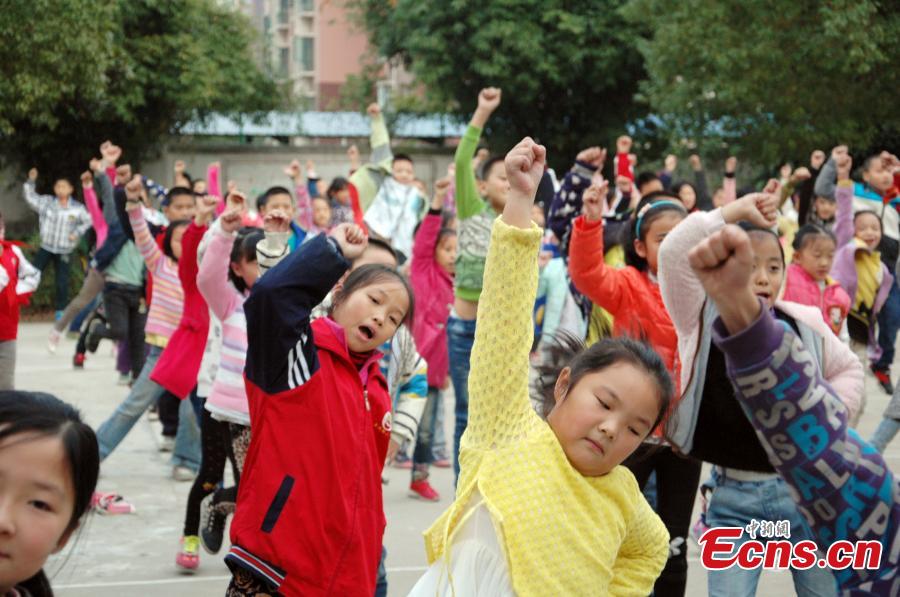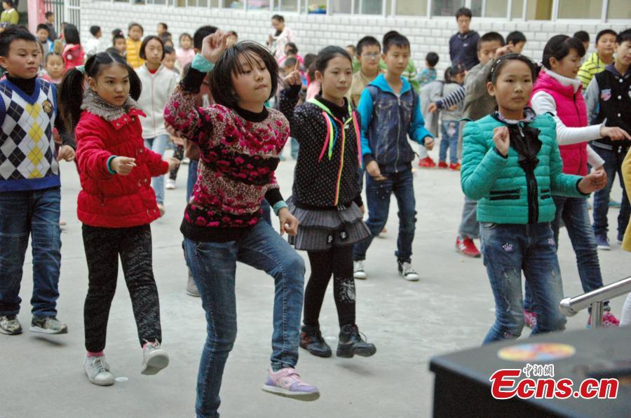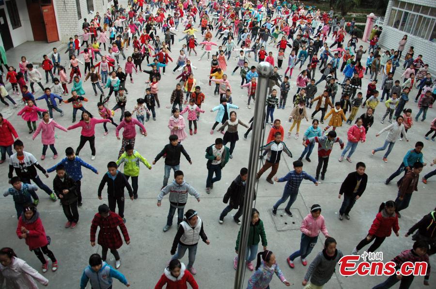 Students practice square dance on playground in a primary school in Xiangyang, Hubei province. The school has added square dancing to their curriculum for over three years. The students practice square dancing during class break instead of other exercises. The whole school also has a class every Wednesday afternoon to learn new square dancing moves. (Photo/CFP)