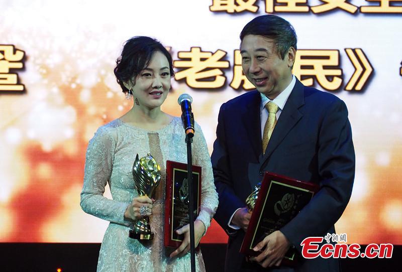 Actress Michelle Rodriguez receives the best actress award at the Ricardo Montalban Theatre during the Chinese American Film Festival in Los Angeles, the United States, on Nov. 3, 2015. (CNS photo/Mao Jianjun)