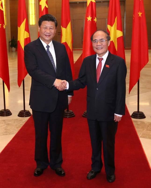 Chinese President Xi Jinping meets with Vietnamese National Assembly Chairman Nguyen Phu Trong and delivers a speech in Vietnam's National Assembly in the capital Hanoi on November 6, 2015. (Photo/Xinhua)