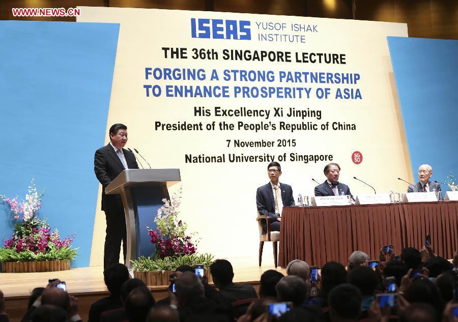 Chinese President Xi Jinping delivers a speech at the National University of Singapore in Singapore, Nov. 7, 2015. (Photo: Xinhua/Lan Hongguang)