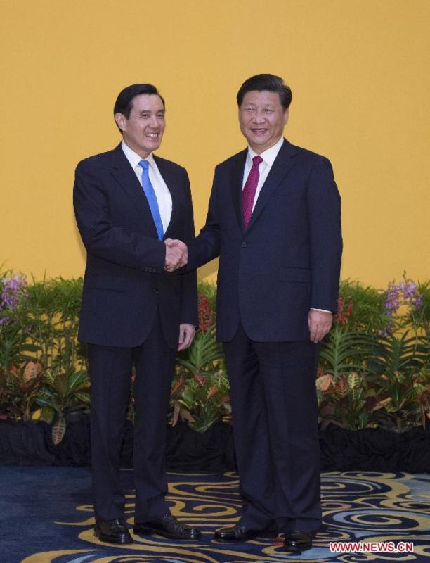 Xi Jinping and Ma Ying-jeou meet on Saturday afternoon at the Shangri-La Hotel in Singapore, marking the first face-to-face exchange and communication between the two leaders across the Taiwan Straits since 1949. (Photo/China News Service)