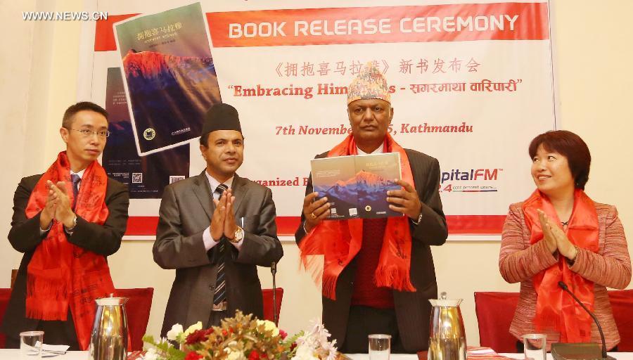 Chancellor of Nepal Academy Ganga Prasad Uprety (2nd R), along with other delegates, attends the releasing ceremony of the book "Embracing Himalayas" written by Nepalese and Chinese authors in Kathmandu, Nepal, Nov. 7, 2015. (Xinhua/Sunil Sharma)
