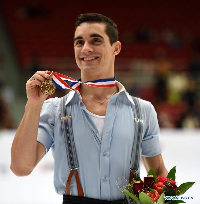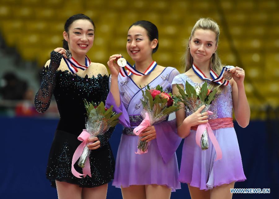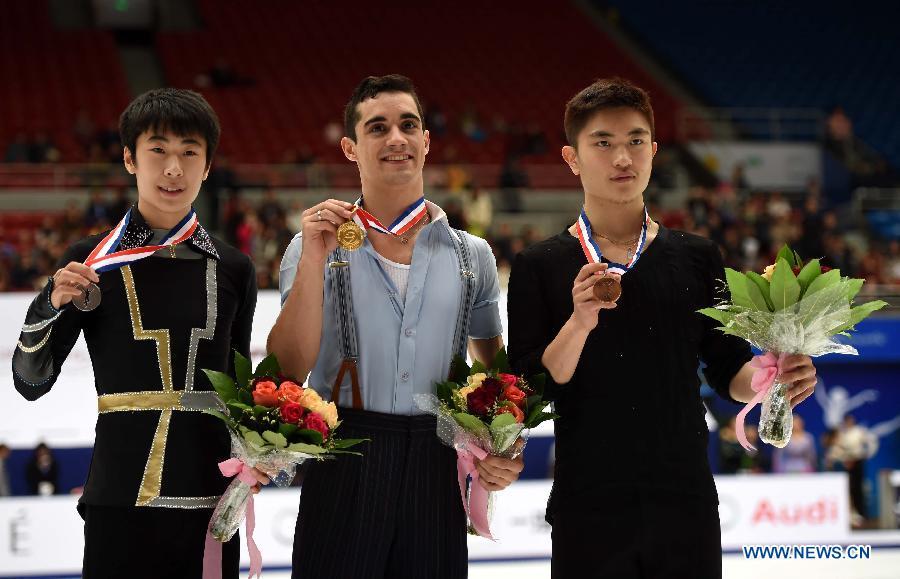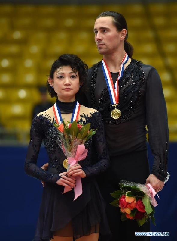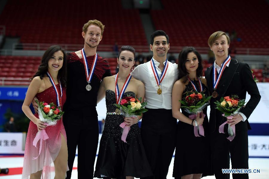 Gold medalists Anna Cappellini (L) and Luca Lanotte of Italy pose during the awarding ceremony of the ice dance category at the 2015 Audi Cup ISU Grand Prix of Figure Skating in Beijing, capital of China, on Nov. 7, 2015. (Xinhua/Guo Yong)