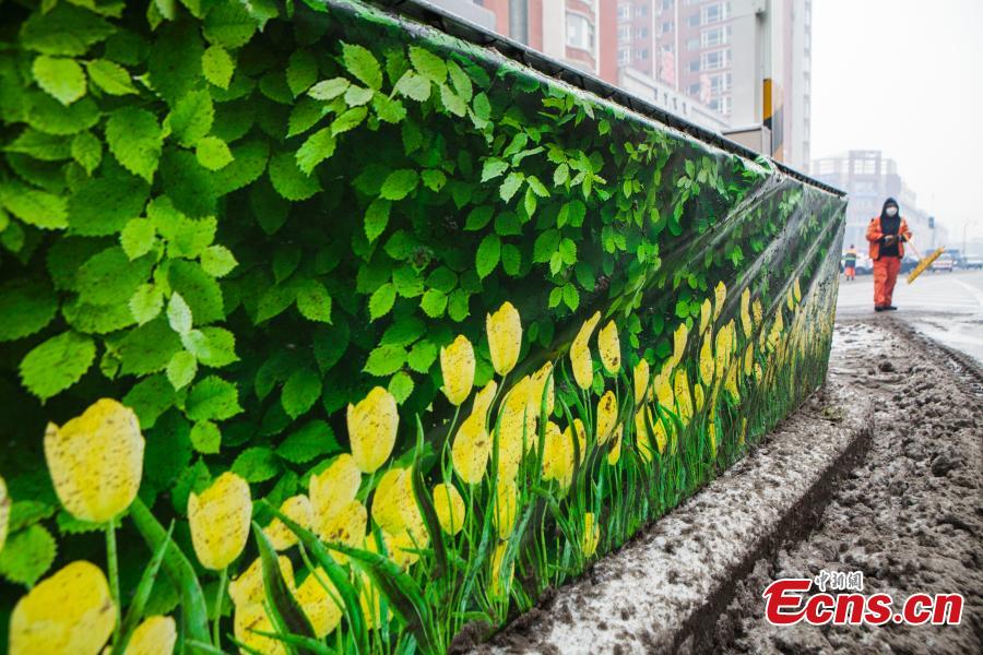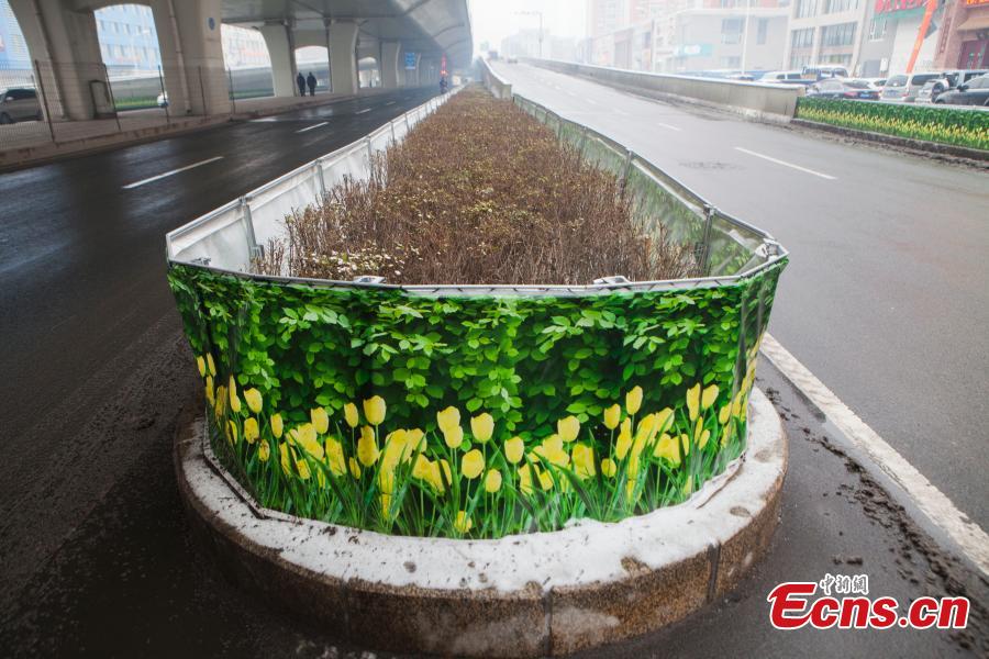 An advertising banner painted with trees and flowers are seen set up along a road in Changchun, Northeast China's Jilin province on November 9, 2015. The banner looks like a green belt at the first sight. (Photo/CFP)