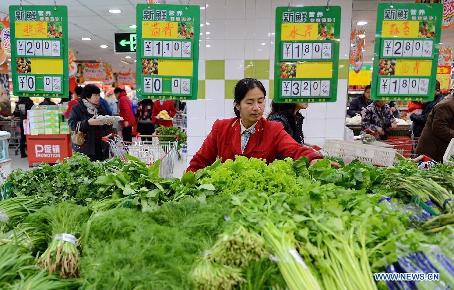 A vegetable dealer sells green Chinese onion at a market in Taiyuan, capital of north China's Shanxi Province, Oct. 27, 2015. China's consumer price index (CPI), the main gauge of inflation, grew 1.3 percent year on year in October, the National Bureau of Statistics (NBS) said Tuesday. The weaker-than-expected reading slowed from the 1.6-percent gain in September and 2-percent in August. On a monthly basis, consumer prices edged down 0.3 percent. (Photo: Xinhua/Zhan Yan)