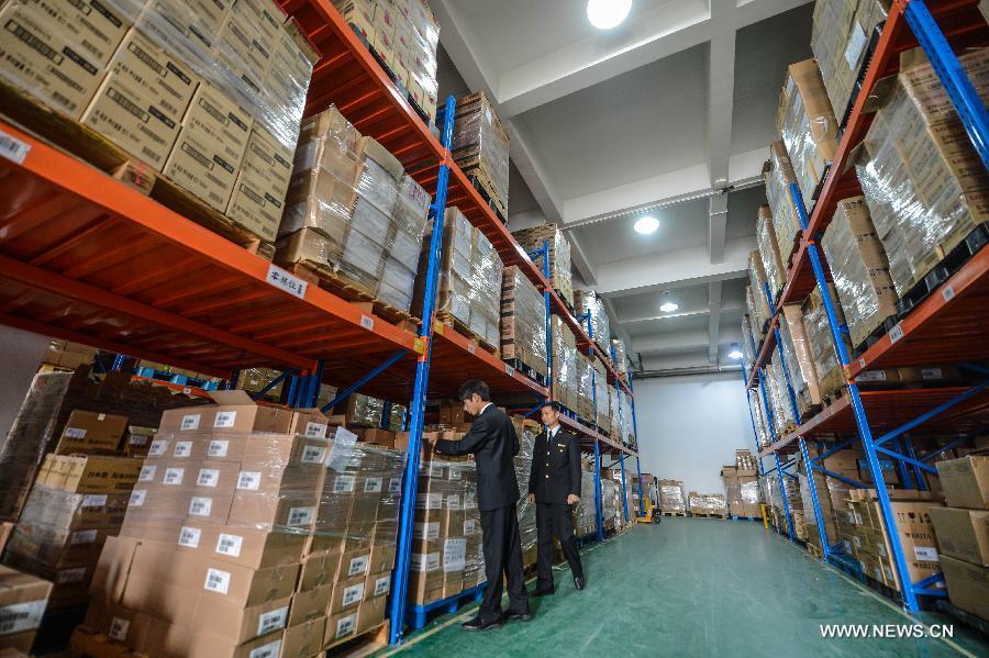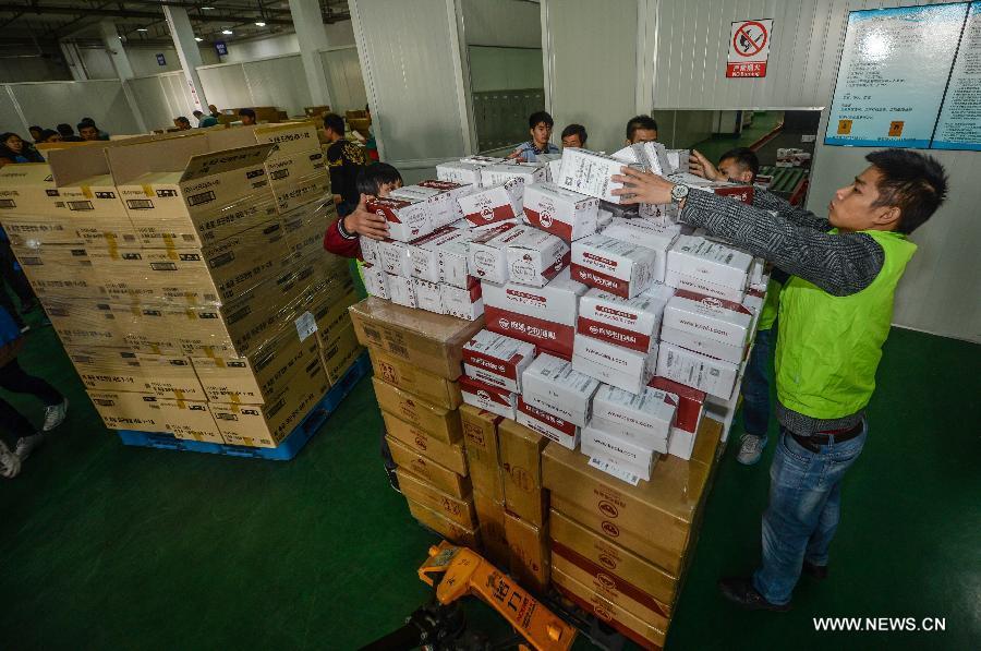 A worker puts imported goods on shelves at the Hangzhou Cross-Border E-Commerce Industrial Park in Hangzhou, capital of east China's Zhejiang Province, Nov. 10, 2015. Over 10 million imported goods have been stored at the Hangzhou Cross-Border E-Commerce Industrial Park by Nov. 9 ahead of the annual online sales campaign Singles Day which falls on Wednesday. (Photo: Xinhua/Xu Yu)
