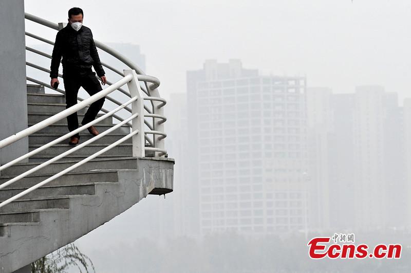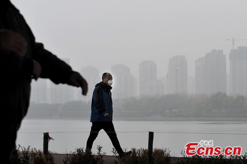 People walk on smog-enveloped road in Shenyang, capital of northeast China's Liaoning Province, Nov. 11, 2015. (CNS photo/Sun Haosheng)