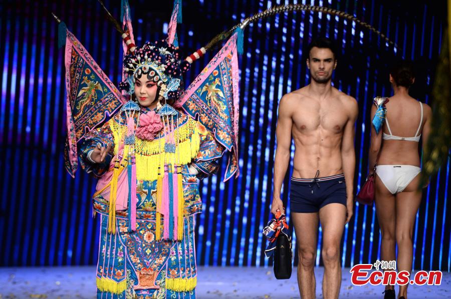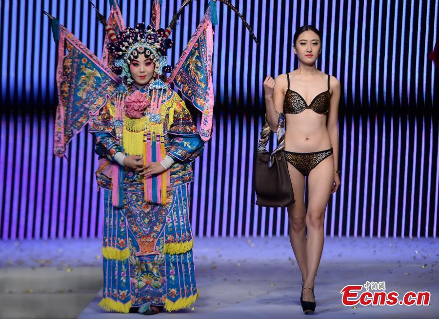 Models in swimwears show luxury bags while Peking Opera actors performing on the same stage during a fashion show in Jinan, East China’s Shandong province on November 11, 2015. Over 20 models and four Peking Opera actors were invited to perform in the event. (Photo/CFP)