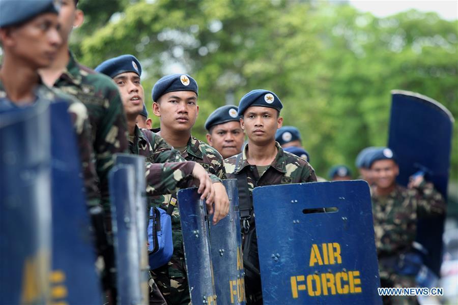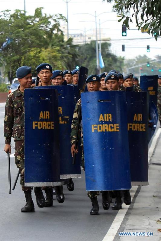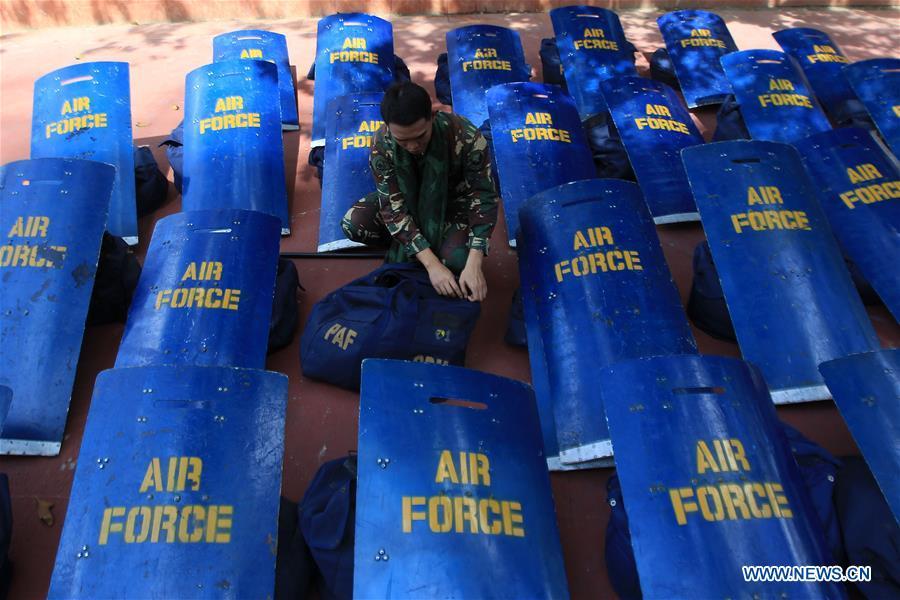 A soldier from the Philippines Air Force (PAF) checks his bag among his comrades' shields in Manila, the Philippines, Nov. 12, 2015. The Philippine government assured Wednesday the security of all the participants in the upcoming Asia Pacific Economic Cooperation (APEC) Summit, citing there is no "specific threat" that could impact the country's hosting of the regional event. (Photo: Xinhua/Rouelle Umali)