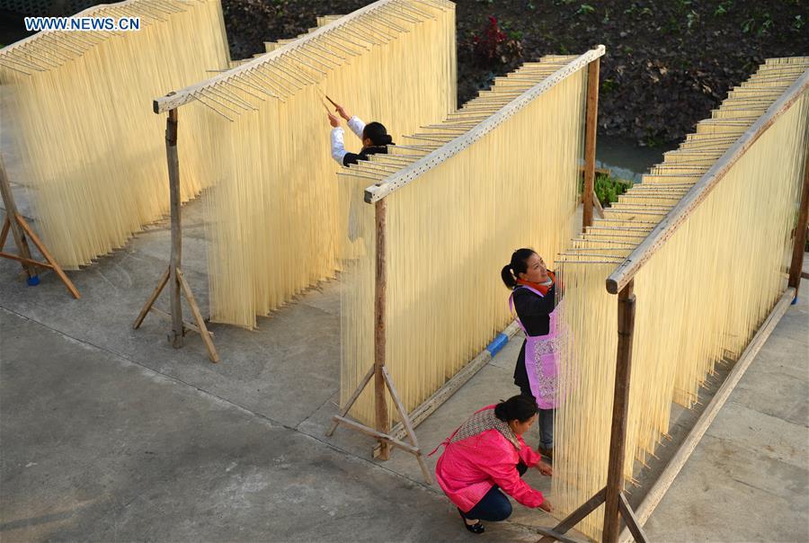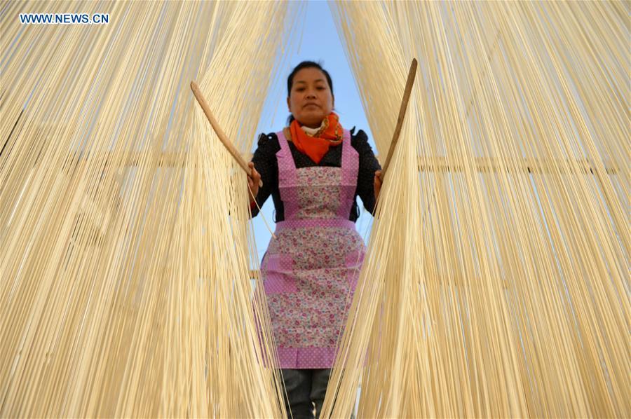 Villager Ni Xinglan collects dried vermicelli at home in Linze Village, Huaian City of east China's Jiangsu Province, Nov. 12, 2015. Linze Village, long famous for its handmade vermicelli, has passed on the traditional handicraft for about one hundred years. (Photo: Xinhua/Zhou Hongming)