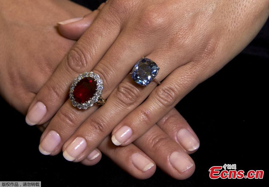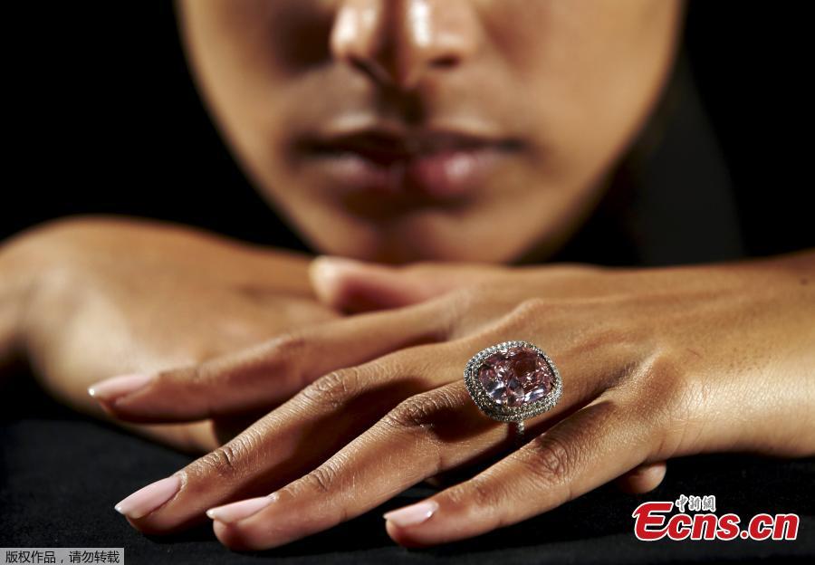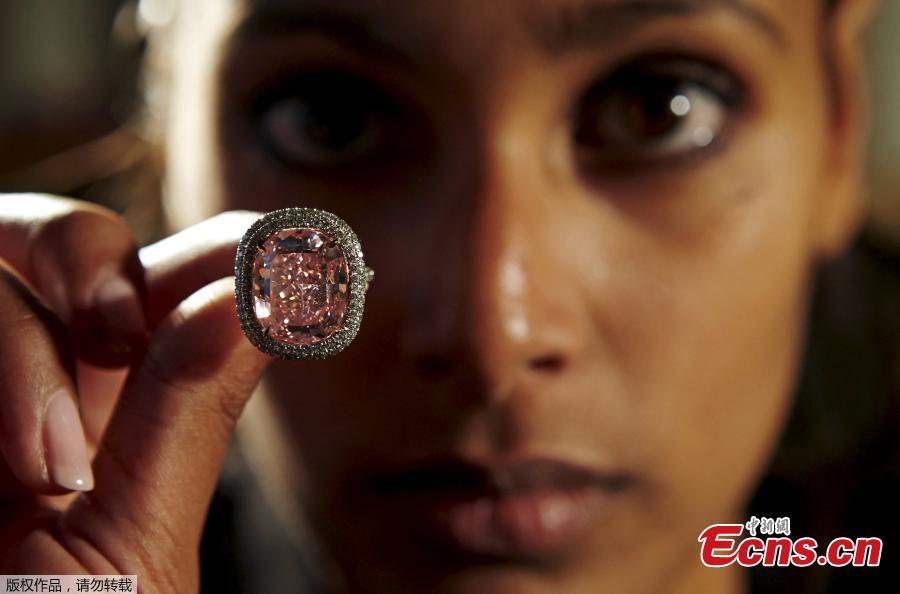 In this file photo, a Sotheby's employee displays a rare diamond dubbed "Blue Moon" during an auction preview. Hong Kong property tycoon Joseph Lau bought the 12.03-carat diamond for his daughter with a record 375 million HK dollars($48.39 million). Lau bought the gem at a Sotheby's auction and renamed it "The Blue Moon of Josephine" after his seven-year-old daughter. The sale came the day after he spent 28.5 million U.S. dollars on a rare 16.08-carat pink diamond, which he named "Sweet Josephine." (Photo/Agencies)