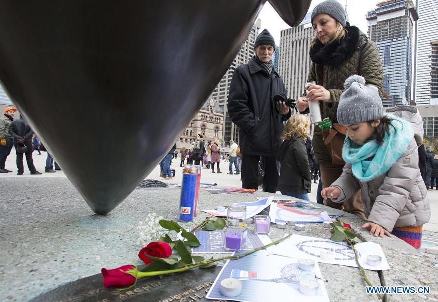 People light candles to mourn the victims of the Paris terrorist attacks in front of Saint Stephen Basilica in Budapest, Hungary, on Nov. 14, 2015. (Photo: Xinhua/Attila Volgyi)