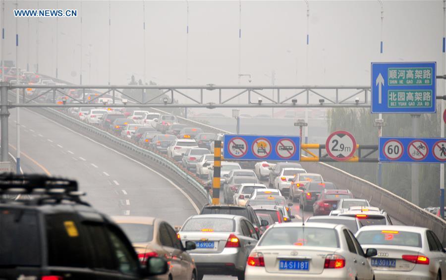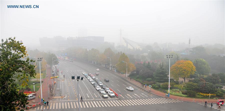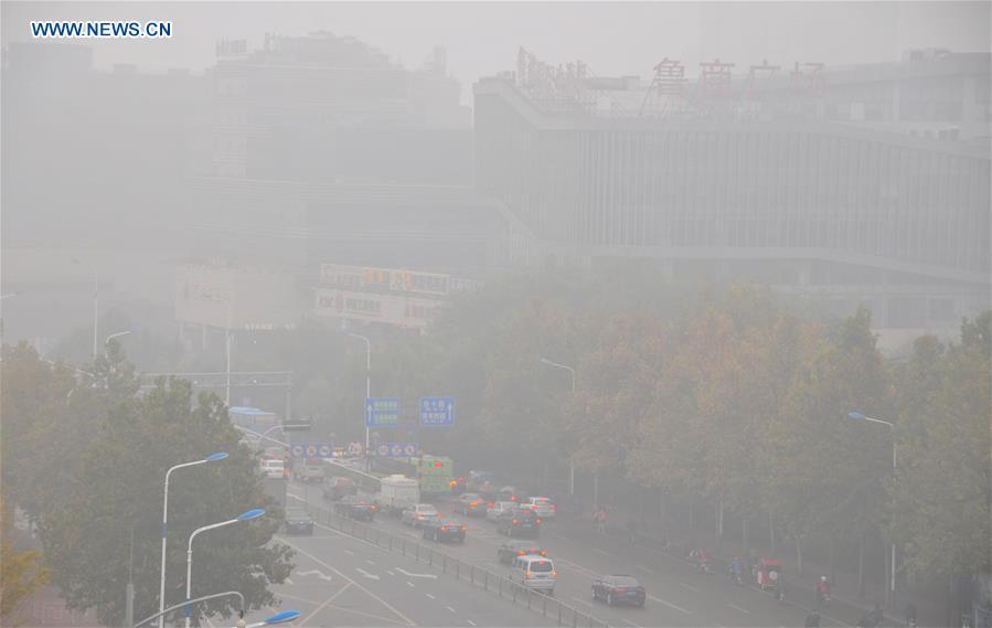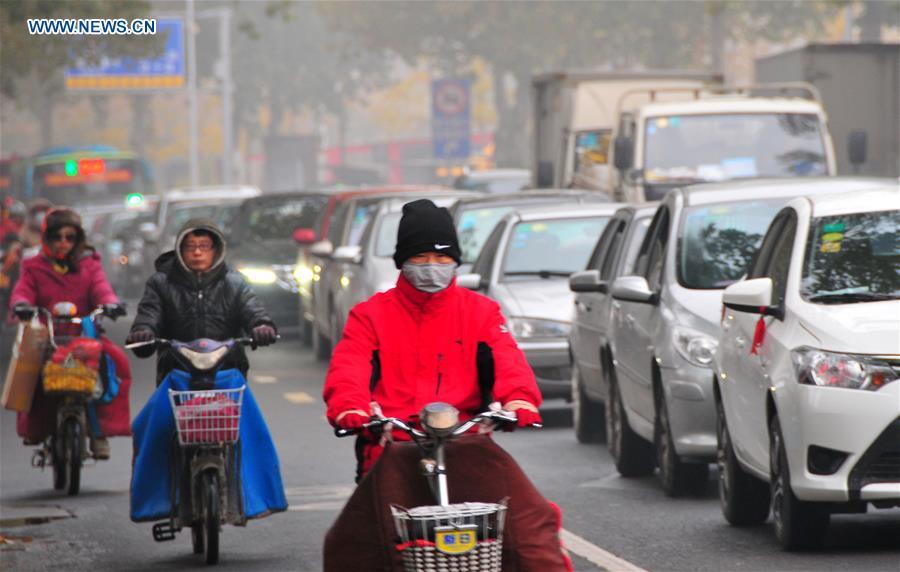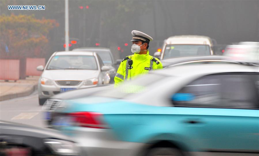 A traffic policeman wears mask while working on a crossroad in Jinan, capital of east China's Shandong Province, Nov. 16, 2015. (Xinhua/Zhang Zhilong)