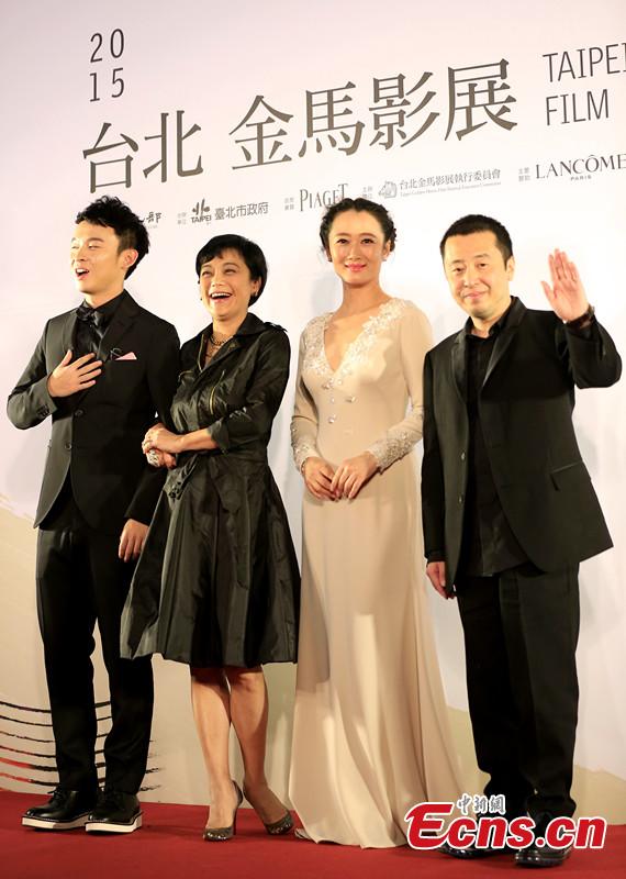 Nov. 17th, Taipei, the 2015 Taipei film festival(the Golden Horse Prize) started. Jia Zhangke (1st from right), director of "Mountains May Depart", and Zhang Aijia(2nd from left), Zhao Tao(2nd from right), both the actresses of this film, are facing to fans during the opening ceremony. (CNS photo/Chen Xiaoyuan)
