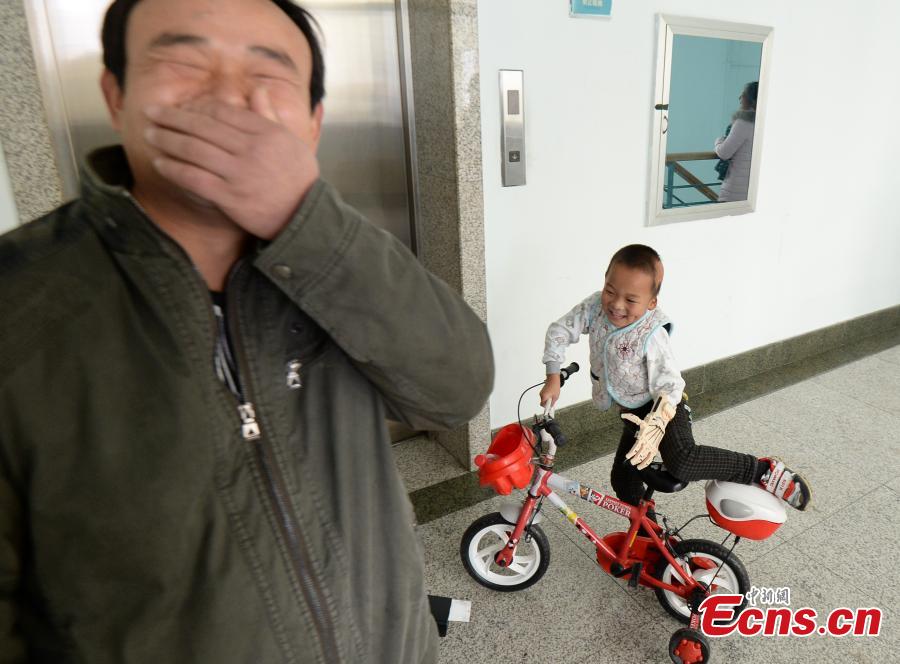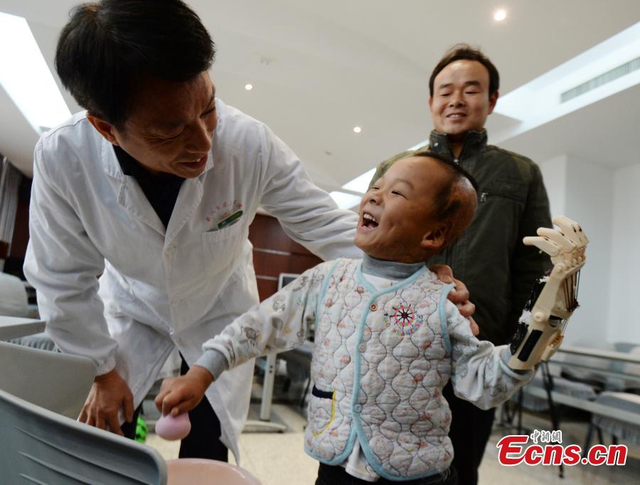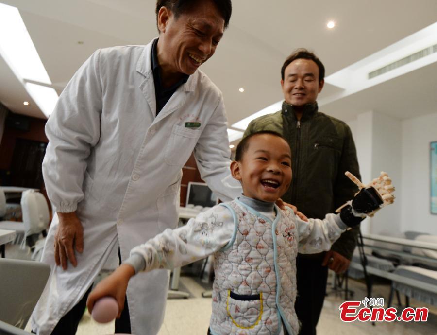 A Chinese boy, known as Xiaohu uses his 3D printed hand to raise up a basin at a hospital in Wuhan, Central China’s Hubei province. In October 2013, three-year-old Xiaohu fell into a fire pit. The fire left him with burns to 45 percent of his body, and his left hand was so severely burned that the doctor had to perform an amputation. Xiaohu’s father Liu Tao was delighted to see his son able to hold and grasp with his left hand again. Xiaohu became the first burn amputee in China to receive a 3D printed hand. (Photo/CFP)