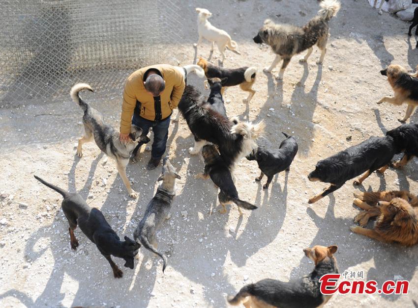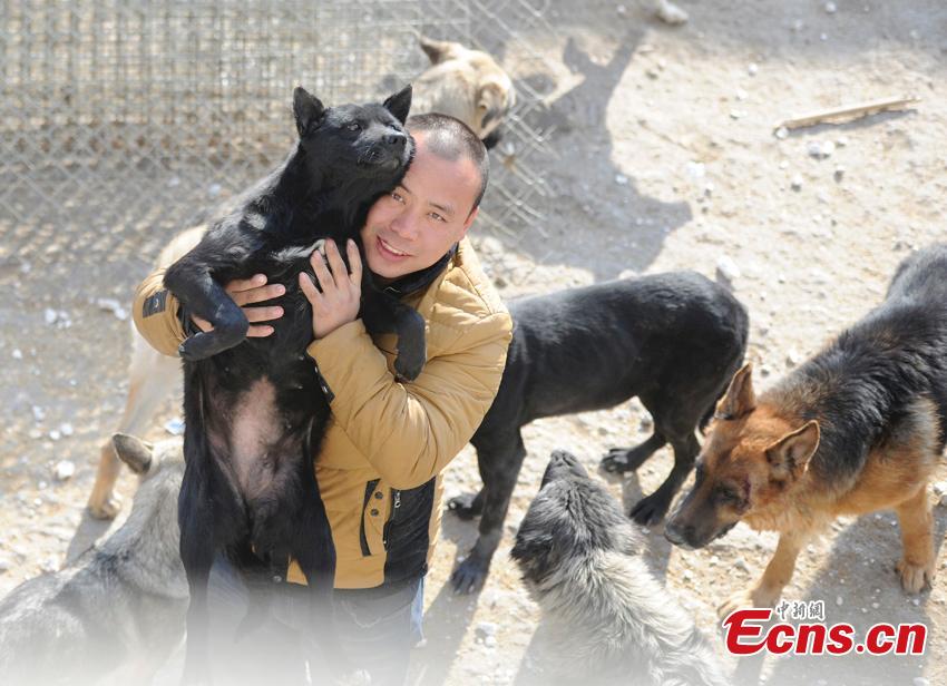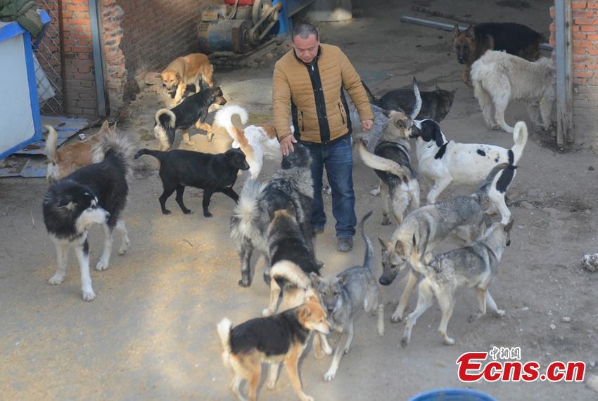 Wang Yan, an animal lover plays with dogs he saved in a rescue center in Helong town in Changchun, Northeast China's Jilin province on November 18, 2015. Wang saved over 2,000 dogs from slaughter houses in the past three years. He has spent over one million yuan($156,755) on keeping and feeding dogs. (Photo: China News Service/ Zhang Yao)