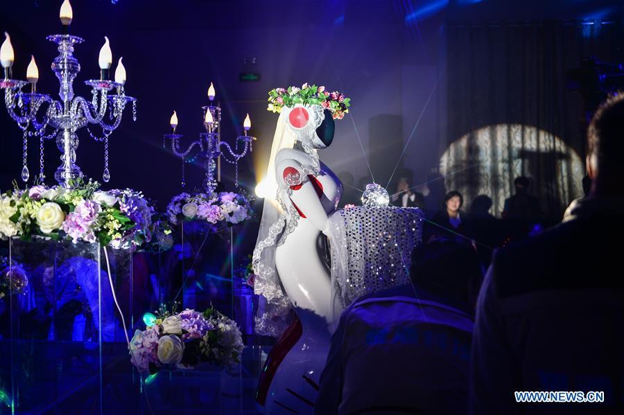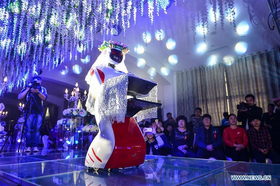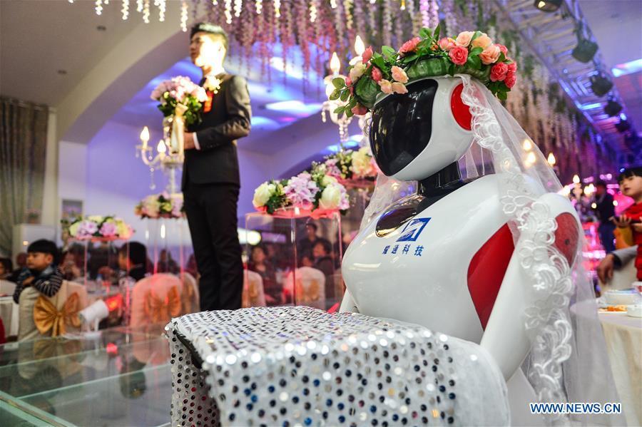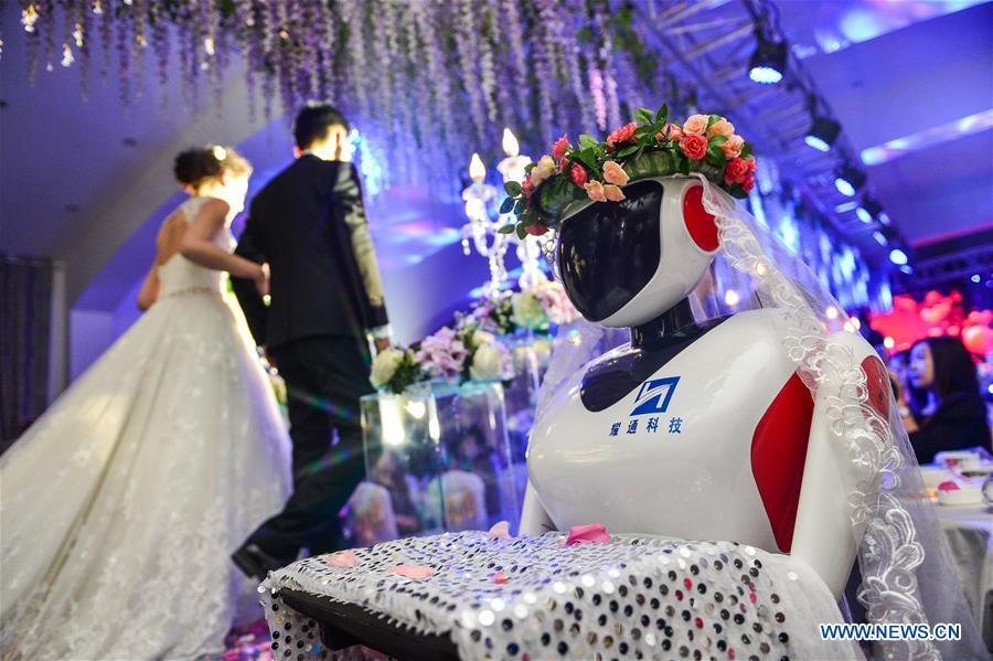 A robot bridesmaid attends a wedding ceremony in Tianjin, north China, Nov. 1, 2015. A robot invented by a technology company in Tianjin to serve as waitress in restaurant was used to act as a bridesmaid in a wedding ceremony here on Nov. 1. (Xinhua/You Sixing)