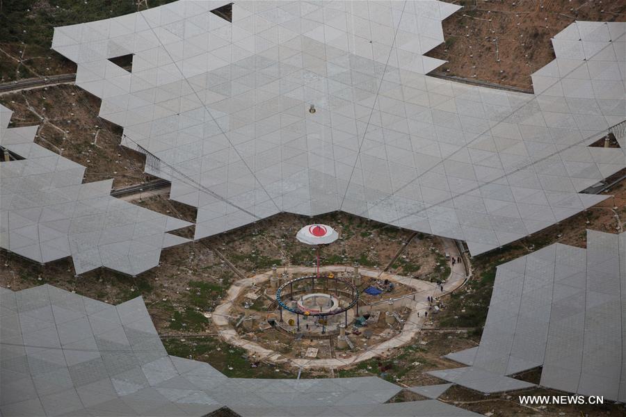 The feed cabin supporting system of China's single-aperture spherical telescope "FAST" is under test in Qiannan of southwest China's Guizhou Province, Nov. 21, 2015. When it is completed in 2016, the five hundred meter aperture spherical telescope (FAST) will be the world's largest, overtaking Puerto Rico's Arecibo Observatory, which is 300 meters in diameter. (Photo: Xinhua/Jin Liwang)