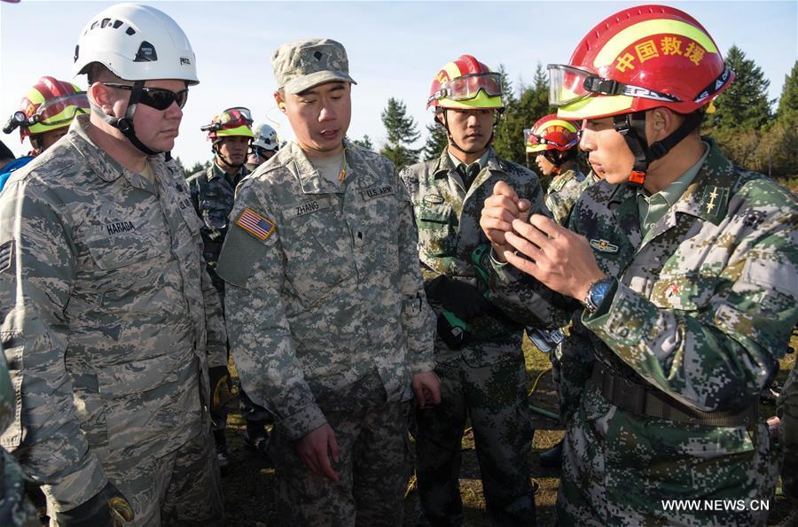 Chinese and American soldiers worked together to practice on humanitarian assistance and disaster relief operations at Joint Base Lewis-McChord, southwest of Seattle, Washington state, the United States on Nov. 20, 2015. It was the 3rd time that Chinese and U.S. soldiers engaged in practical field exchange of the kind, as part of an annual bilateral disaster management exchange program aimed at building up capabilities to cooperate in an emergency scenario. In previous two events, the two sides had field exchanges in Oahua, Hawaii, of the U.S. and in Haikou, Hainan of China. (Photo: Xinhua/Bao Dandan)