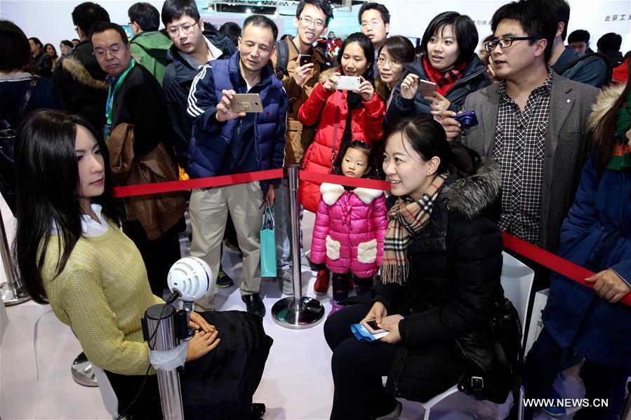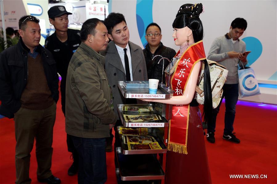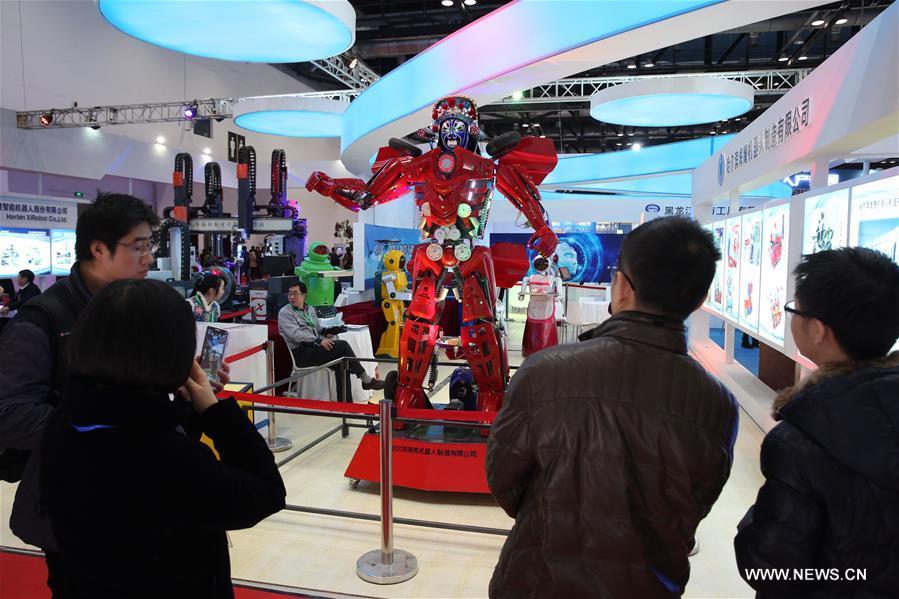 Robots that can serve as waiters are demonstrated during the World Robot Conference in Beijing, capital of China, Nov. 23, 2015. (Photo: Xinhua/Jin Liwang)