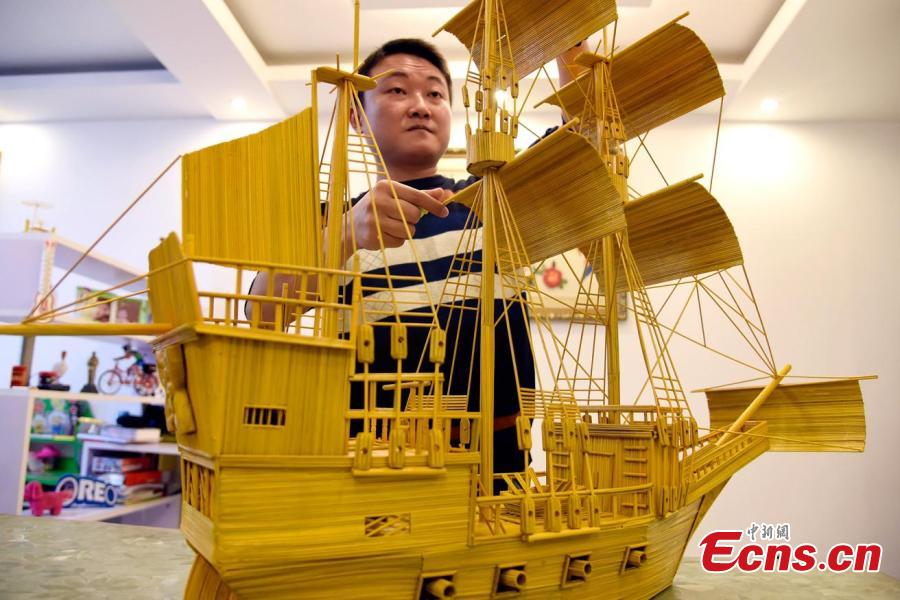 Folk artist builds 'Mayflower' with 15,000 bamboo skewers(1/3)