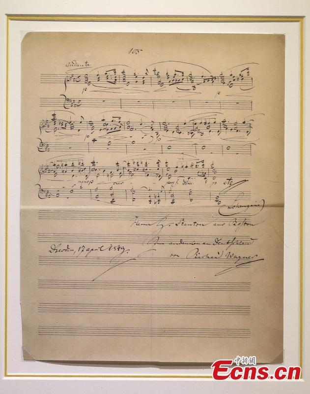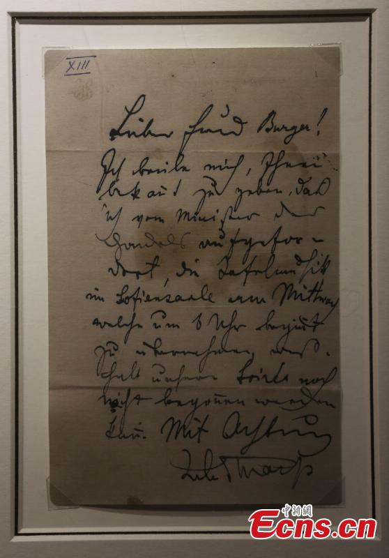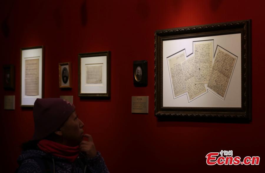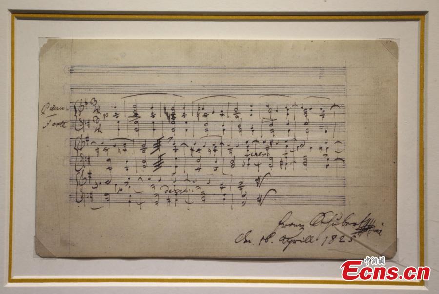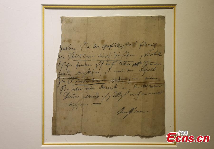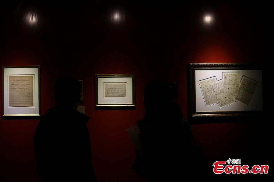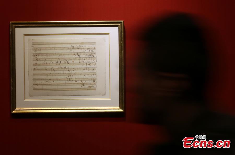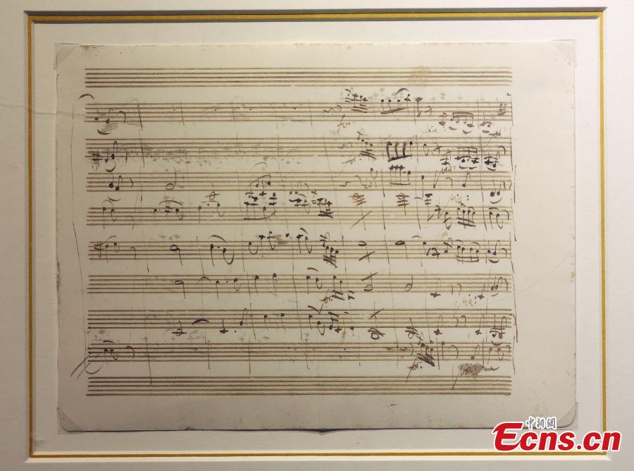 The photo taken on November 26, 2015 shows a handwritten manuscript of Ludwig van Beethoven displayed at an exhibition in Nanjing, East China’s Jiangsu province. The event opened on Thursday features manuscripts of masters including Wolfgang Amadeus Mozart, Ludwig van Beethoven, Peter Lynch Tchaikovsky, Franz Seraphicus Peter Schubert, Johann Strauss, and Wilhelm Richard Wagner. (Photo: China News Service/ Yang Bo)