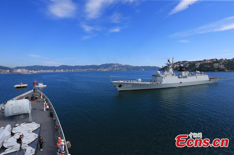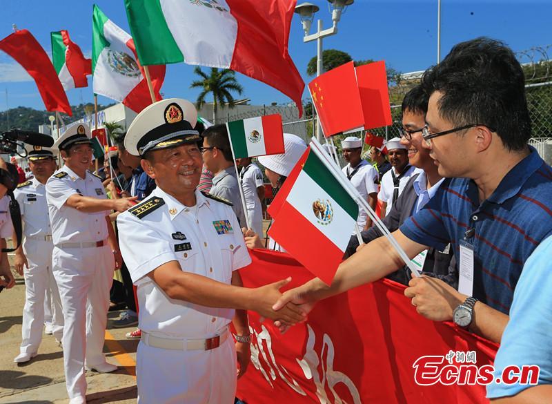Chinese residents in Mexico welcome visiting ships of the Chinese People's Liberation Army Navy (PLAN) at the port of Acapulco, Mexico, on Nov. 24, 2015. A flotilla of the Chinese People's Liberation Army Navy (PLAN) arrived in the Mexican port of Acapulco on Tuesday to begin a friendly visit. (CNS photo/Dai Zongfeng)