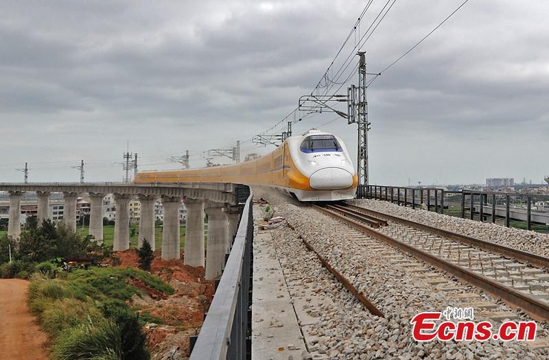 A test train pulls in Haikou, south China's Hainan Province, Nov. 26, 2015. South China's island province Hainan began a trial run on Thursday of a new stretch of track that completes the world's first high-speed train line circling an island. Up to 20 empty trains will run on the 345-km Western Ring Railway per day in the trial period. Exercises will test responses to emergency situations. The western stretch will be officially put into operation at the end of this year with a designed speed of 200 km per hour, according to its operator, the Guangzhou Railway Corporation. The western stretch has 16 stops in six cities and counties, linking provincial capital Haikou with Sanya, a tropical tourist spot. It began construction in September 2013 with an investment of 27 billion yuan (4.23 billion U.S. dollars). With a land area of 35,400 square km, Hainan is slightly larger than Belgium. A popular destination for beach lovers, it is expected to receive 47 million visitors this year. (CNS photo/Luo Yunfei)