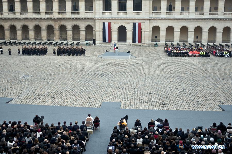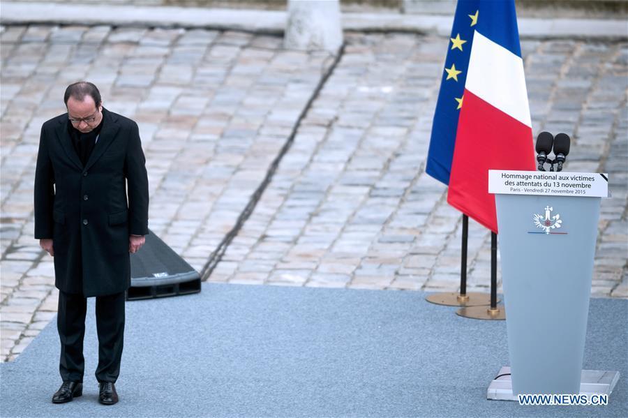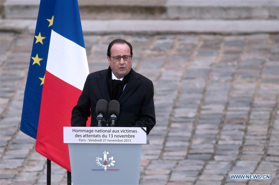 French President Francois Hollande presides over a ceremony to pay tribute to the 130 people killed during the Nov. 13 terrorist attacks at the military museum Les Invalides in Paris, France, Nov. 27, 2015. (Xinhua/Marc El Chombier)