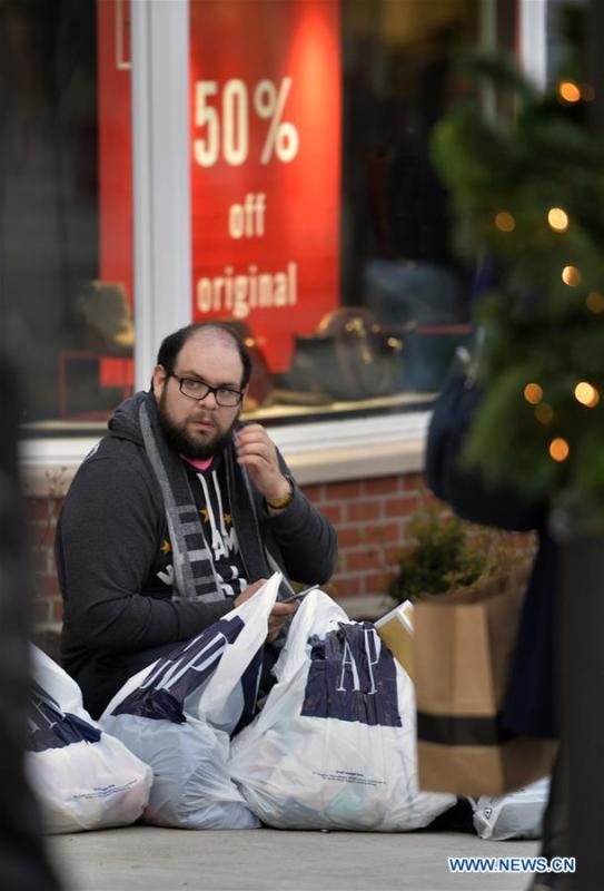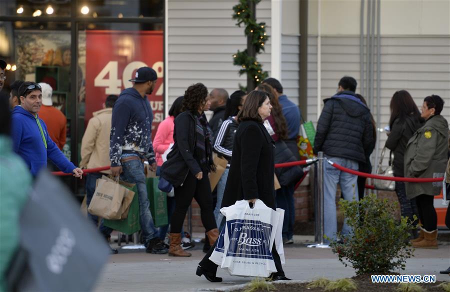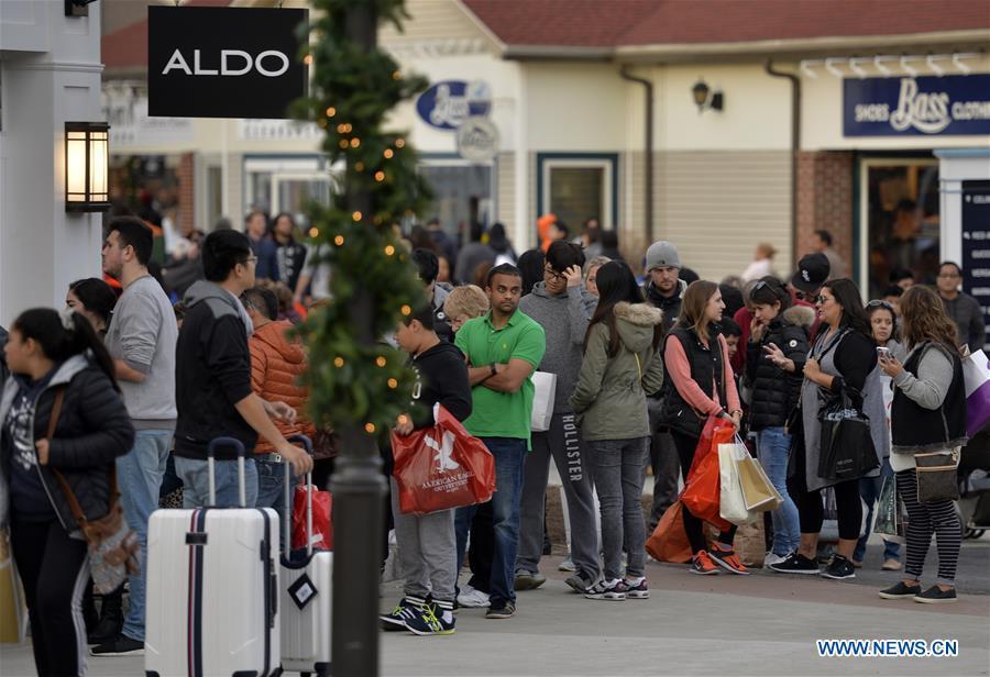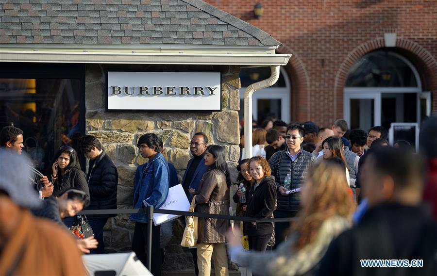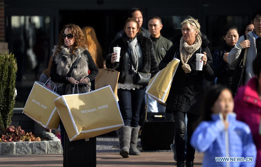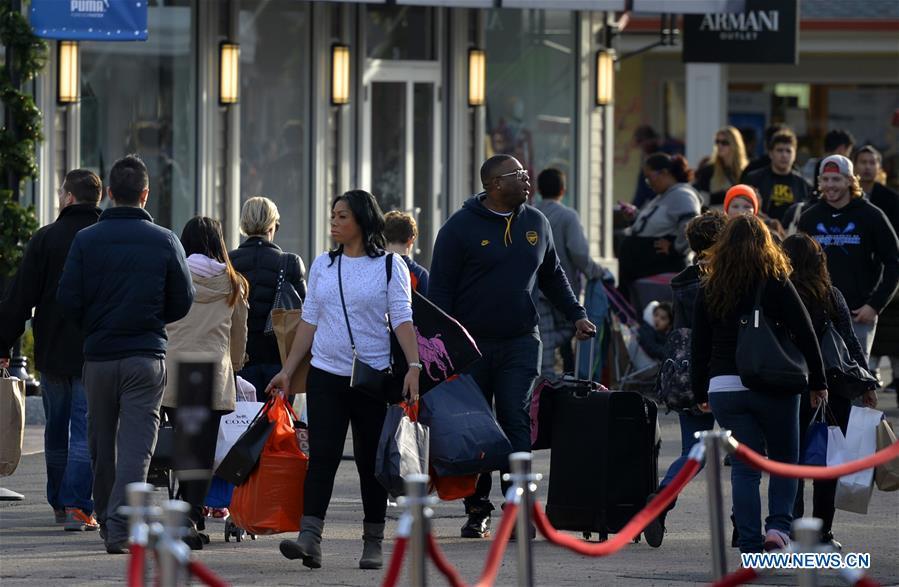 Shoppers flock to stores for Black Friday bargains at Woodbury Premium Outlets, New York, on Nov.27. The Thanksgiving Weekend Expectations survey found 99.77 million people planning to shop on Black Friday, more than that of last year, which was 95.51 million. (Xinhua/Wang Lei)