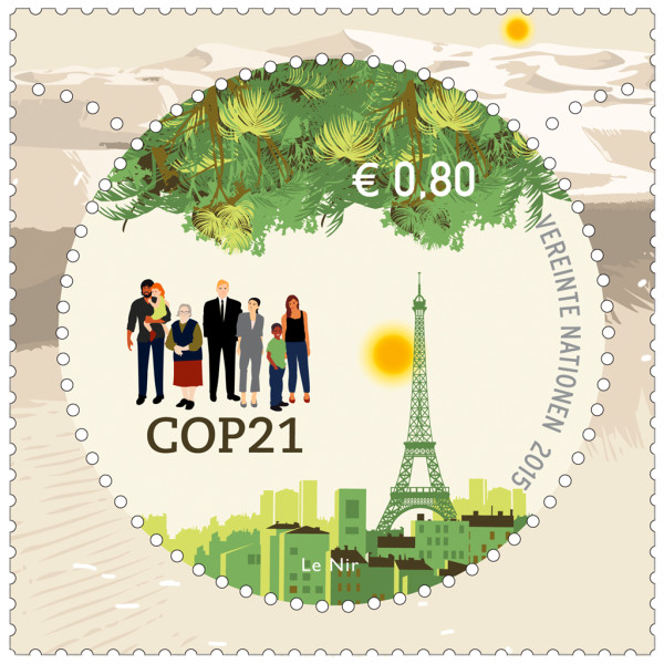 Photo shows the stamp jointly issued by La Poste, France and the United Nations Postal Administration (UNPA) to commemorate the 21st United Nations Climate Change Conference, COP21. (Photo/unstamps.org)