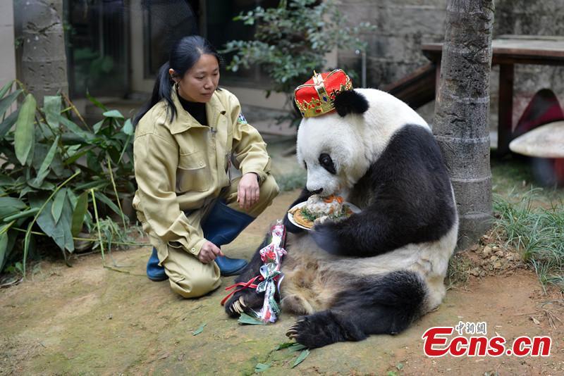 The photo taken on on Nov. 28, 2015 shows giant panda Basi eating a cake at the panda research and exchange center in Fuzhou, capital of southeast China's Fujian Province. Basi celebrated her 35th birthday on Nov. 28, 2015, which roughly equals 130 years in human age. Basi is currently the oldest living panda so far in the world. Basi in 1987 visited the U.S. San Diego Zoo for shows. She attracted around 2.5 million visitors during her six-month stay in the United States and amazed many visitors by her acrobatic performances. In 1990, she was chosen as the prototype for Pan Pan, the mascot for the Beijing Asian Games. (CNS photo/Lv Ming)
